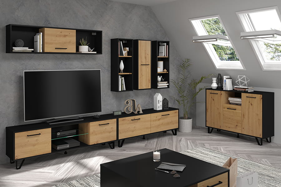 Meble BOSS to kolekcja o nowoczesnej linii. Do produkcji mebli wykorzystano najwyższej jakości płyty laminowane oraz akcesoria, dzięki czemu meble są trwałe i solidne. Na uwagę zasługują wysokie, metalowe nóżki w kolorze czarnym. Kolekcja jest dostępna w kilku wersjach kolorystycznych do wyboru. Świetnie sprawdzi się w salonie, pokoju dziennym, przedpokoju, sypialni i innych pomieszczeniach mieszkalnych.