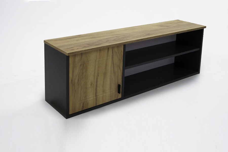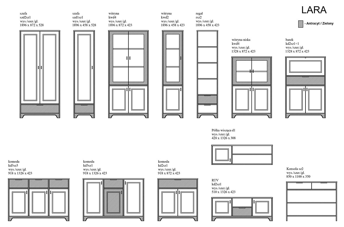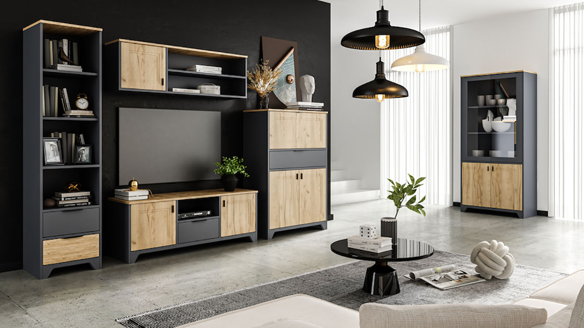 Kolekcja LARA to połączenie nowoczesnego designu z funkcjonalnością, idealne do salonu, jadalni czy gabinetu. Wyraziste zestawienie antracytowych korpusów z frontami w wybarwieniu imitującym naturalne drewno nadaje wnętrzu wyjątkowego charakteru – z jednej strony przytulnego, z drugiej eleganckiego i ponadczasowego. Lara składa się z mebli takich jak: komoda dwudrzwiowa, komoda trzydrzwiowa z szufladą lub bez, półka ścienna, jednodrzwiowy regał, szafa, witryna jednodrzwiowa lub dwudrzwiowa, szafka RTV oraz opcjonalne wyposażenie szafy. Z kolekcją LARA stworzysz wnętrze, które zachwyca stylem i komfortem użytkowania. To propozycja dla osób, które cenią sobie nowoczesny design w połączeniu z naturalnym, drewnopodobnym wykończeniem.