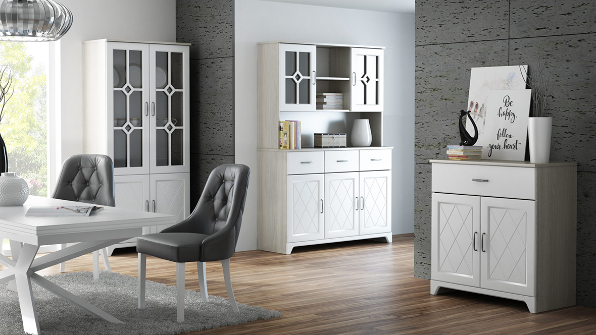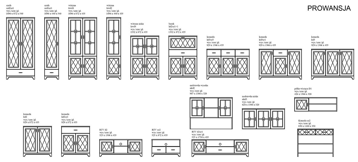 Kolekcja Prowansja została stworzona z myślą o stworzeniu unikatowego, a jednocześnie eleganckiego pokoju dziennego. Kolekcja dostępna jest w dwóch wersjach kolorystycznych do wyboru. Cechą charakterystyczną kolekcji są frezy na froncie mebli oraz metalowe uchwyty. Do produkcji wykorzystano wysokiej jakości płyty meblowe laminowane oraz płyty MDF. Biały zestawiony z kolorystyką prezentuje się zjawiskowo nadając przyjemny klimat w salonie. Kolekcja odmieni Twój pokój dzienny, za sprawą czego przebywanie w tym pokoju nabierze jeszcze większej przyjemności. Prowansja składa się z mebli takich jak: komoda dwudrzwiowa, komoda trzydrzwiowa z szufladą lub bez, półka ścienna, jednodrzwiowy regał, szafa, witryna jednodrzwiowa lub dwudrzwiowa, szafka RTV oraz opcjonalne wyposażenie szafy.