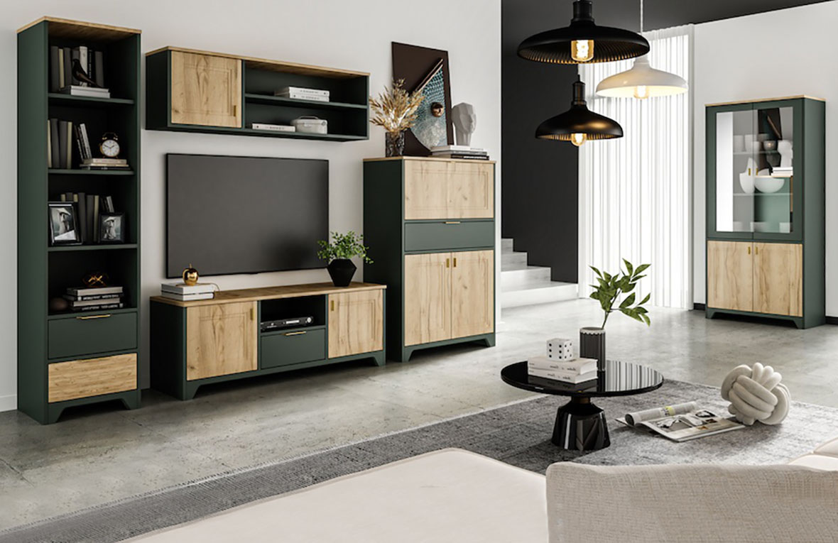 Kolekcja LARA to połączenie nowoczesnego designu z funkcjonalnością, idealne do salonu, jadalni czy gabinetu. Wyraziste zestawienie zielonych korpusów z frontami w wybarwieniu imitującym naturalne drewno nadaje wnętrzu wyjątkowego charakteru – z jednej strony przytulnego, z drugiej eleganckiego i ponadczasowego. Lara składa się z mebli takich jak: komoda dwudrzwiowa, komoda trzydrzwiowa z szufladą lub bez, półka ścienna, jednodrzwiowy regał, szafa, witryna jednodrzwiowa lub dwudrzwiowa, szafka RTV oraz opcjonalne wyposażenie szafy. Z kolekcją LARA stworzysz wnętrze, które zachwyca stylem i komfortem użytkowania. To propozycja dla osób, które cenią sobie nowoczesny design w połączeniu z naturalnym, drewnopodobnym wykończeniem.