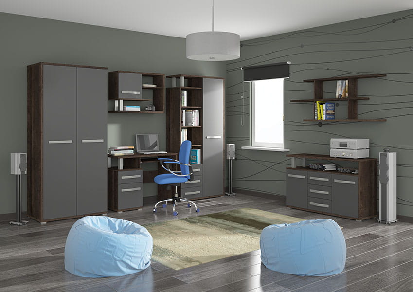 Kolekcja ANGEL to nowoczesne meble przeznaczone do aranżacji pokoju dziennego lub pokoju młodzieżowego. System mebli został wykonany z wysokiej jakości płyty laminowanej. Kolekcja została wykonana w kilku wersjach kolorystycznych do wyboru, dzięki czemu na pewno znajdziemy coś dla siebie. Dzięki użytym do produkcji materiałom mamy pewność, że meble będą nam służyć przez długie lata.