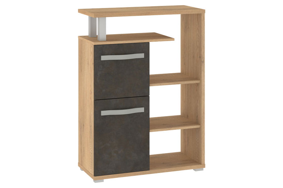 - regał wyposażony jest w 2-drzwiowy front oraz dodatkowe, widoczne półki, które możesz wykorzystać na dowolne przedmioty