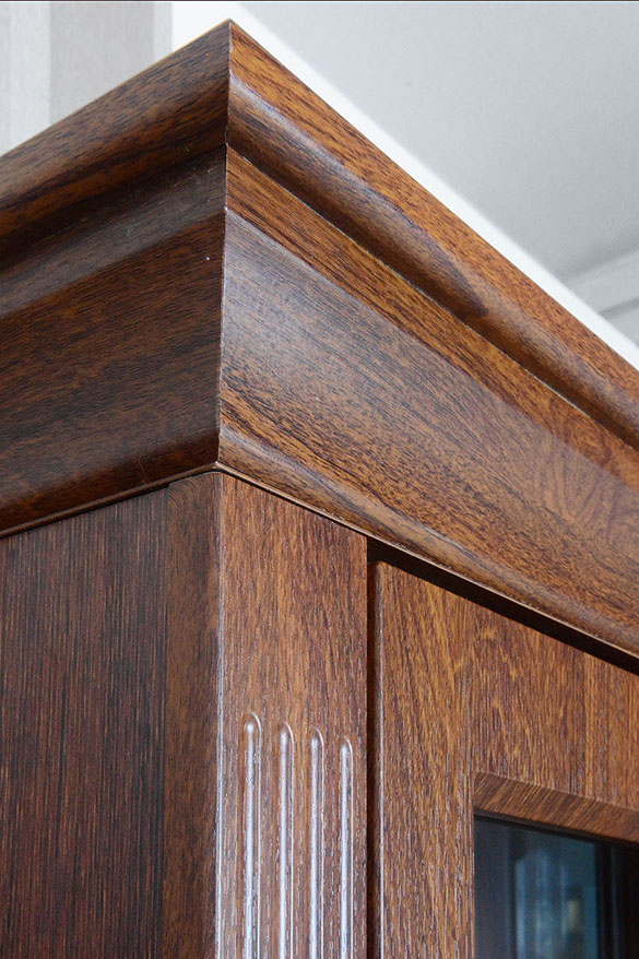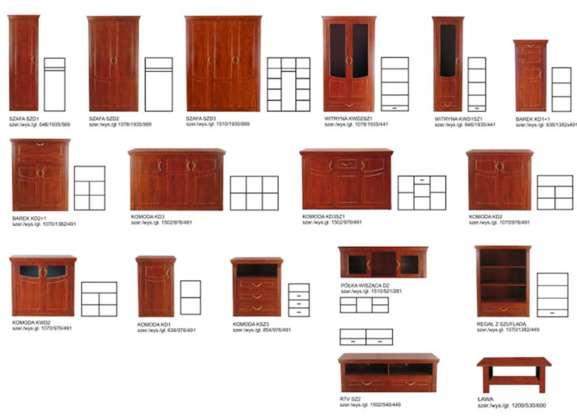 - Kolekcja wyróżnia się wyrafinowanym kształtem koron, wieńców górnych oraz frezowanych frontów mebli, które dodatkowo podkreśla ciepłe wybarwienie kasztanowej okleiny.
