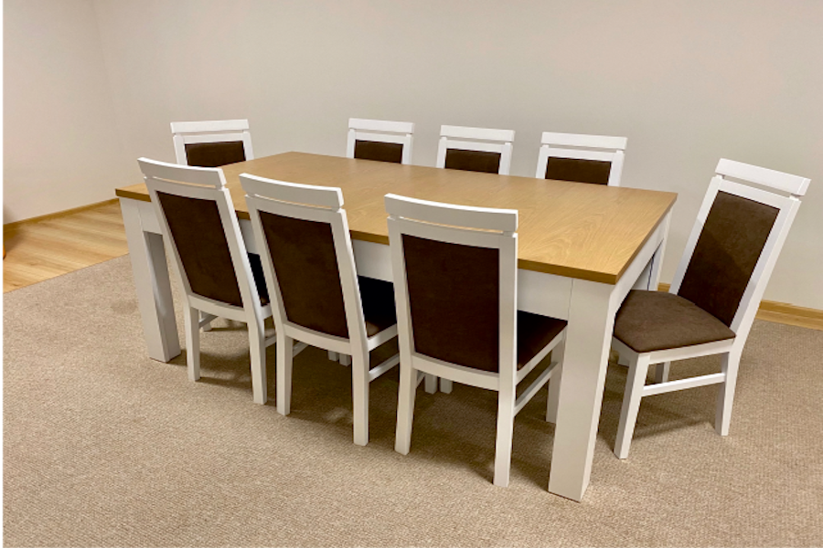 Stół Magnat jest meblem, który znajdzie zastosowanie zarówno w jadalni, jak i w pokoju dziennym. Dobrze prezentować będzie się on we wnętrzach tak nowoczesnych, jak i nieco bardziej klasycznych. Na uwagę zasługują tutaj nietuzinkowo wykonane nogi, które skutecznie przyciągają wzrok. Stół wyposażony jest on w 4 wkładki przedłużające, każda o wielkości 60 centymetrów, które doskonale sprawdzą się podczas wszelkiego rodzaju spotkań towarzyskich. Zastosowany został tu teleskopowy system rozkładania, w ramach którego jedna część blatu przesuwa się razem z nogami, podczas gdy druga pozostaje nieruchoma.