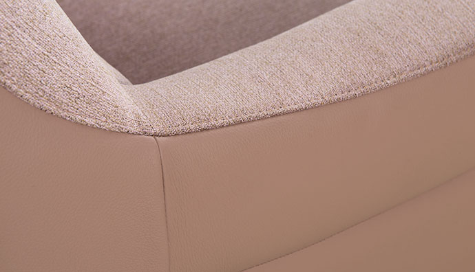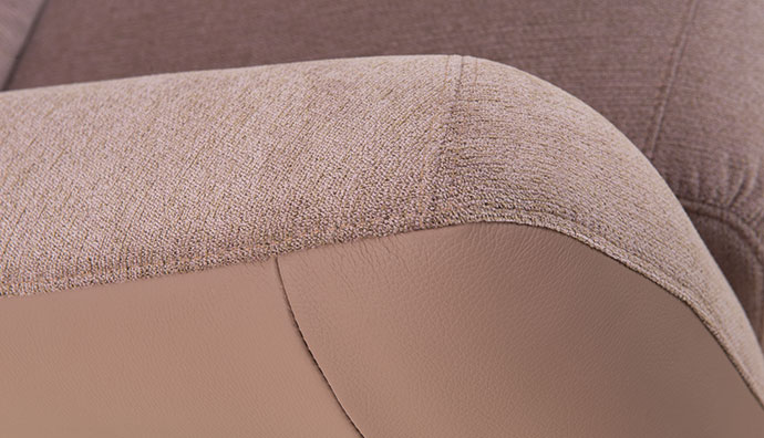Precyzyjne połączenie tkaniny IMPERIAL 324 ze skóra naturalną S2 144. Jest to wysokogatunkowa, miękka skóra, bardzo delikatna w dotyku, ale zarazem bardzo wytrzymała, o pięknej, wyraźnie widocznej fakturze.