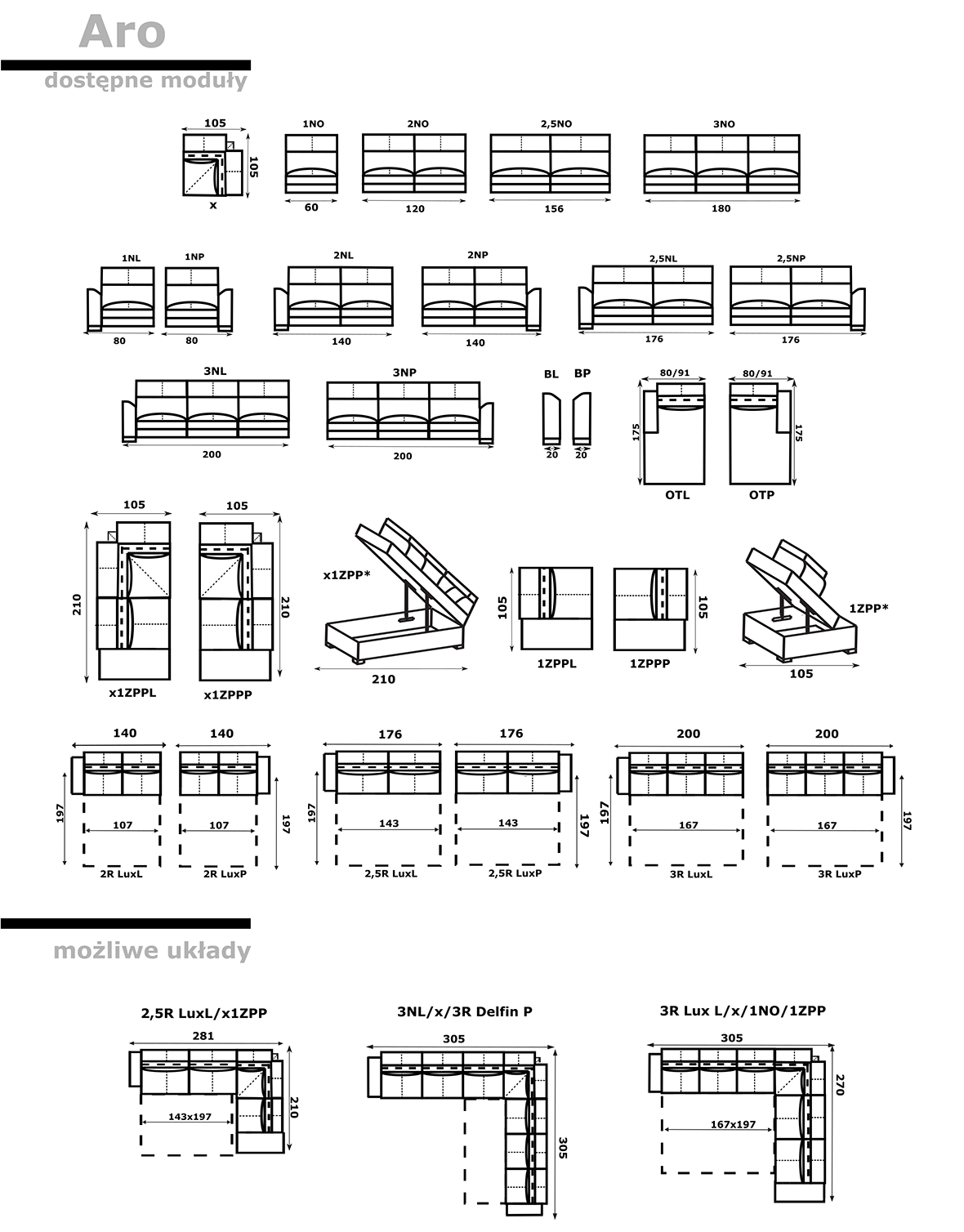 Aro to zestaw nowoczesnych mebli wypoczynkowych składający się z fotela, sofy 2 i sofy 3. Wszystkie elementy mogą posiadać dodatkową funkcjonalność w postaci funkcji relaks sterowanej sensorowo. Meble dostępne są w tapicerowaniu skórą naturalną oraz w tkaninach. Istnieje możliwość modyfikacji wymiarów poszczególnych elementów. W standardzie jest także możliwość przeszycia kontrastowymi nićmi.