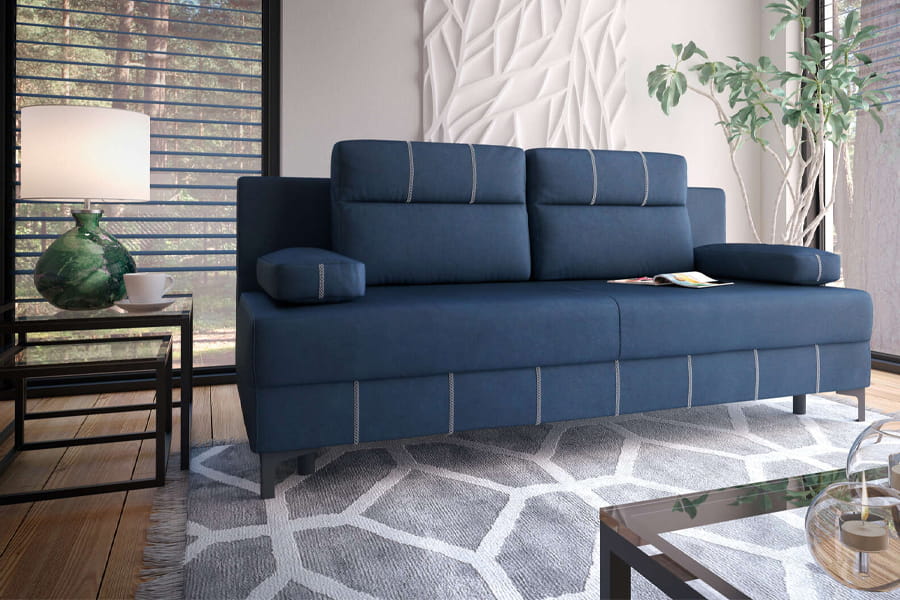 Sofa Diuna to mebel, w którym prostą bryłę ozdobiono w bardzo subtelny sposób nadając jej niepowtarzalny charakter. Blenda siedziska jest przeszyta charakterystycznie, przyjmując kształt rozchylonego kielicha kwiatowego. Dzięki tak ozdobnie wykończonej blendzie mebel nabiera delikatności i wyszukanego stylu. Ozdobą mebla są kontrastowe szwy (stebnówka) dostępne w kilku kolorach. Mebel opiera się na ozdobnych nóżkach chromowanych. Wypełnienie sofy stanowią sprężyny bonellowe (12 cm), co zapewnia wysoki komfort użytkowania. Sofa posiada pojemnik na pościel. Dodatkowym atutem mebla jest wspomaganie otwierania (tzw. automat).