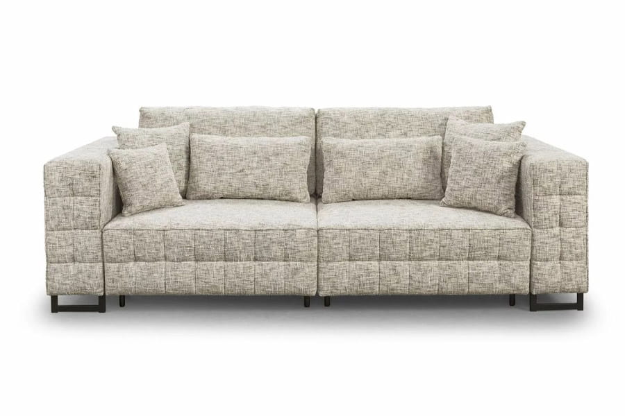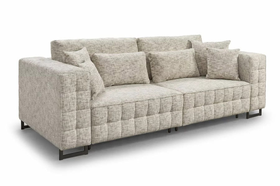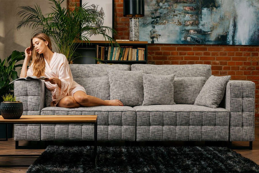 Sofa Gemma to idealny mebel do salonu. Nowoczesna stylistyka i proste geometryczne kształty idealnie wpisują się w aktualne trendy architektury wnętrz. Duża bryła mebla wypełnia przestrzeń i pozwala na swobodny relaks. Dwa niezależnie rozkładane głębokie siedziska pozwalają uzyskać bardzo dużą powierzchnię spania. Szerokie boczki powodują, że mebel prezentuje się okazale i bogato. Pikowania w kształcie kostek czekolady powtarzające się na kilku elementach mebla nadają mu charakteru i nowoczesności. Proste krawędzie zostały podkreślone delikatną kedrą, która podkreśla geometryczne kształty sofy. Wypełnienie mebla jest miękkie i daje efekt lekkiego zapadania. W obu boczkach mebla wbudowane są porty USB z dwoma wejściami – można nie tylko swobodnie leniuchować, ale także pracować. Poduszki oparciowe i poduszki ozdobne wypełniają przestrzeń mebla i dodają miękkości. Mebel ma duży pojemnik na pościel wykonany z białej laminowanej płyty.