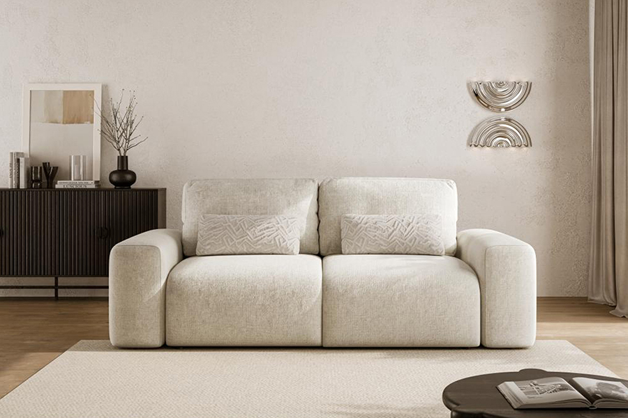 Linea to sofa zaprojektowana z myślą o codziennym użytkowaniu oraz szybkim przekształceniu w komfortowe miejsce do spania. Jej konstrukcja opiera się na solidnym siedzisku wypełnionym sprężyną falistą oraz pianką wysokoelastyczną HR, natomiast oparcie wykonano z tej samej klasy pianki, co zapewnia odpowiednie podparcie pleców. Całość prezentuje się zgrabnie i proporcjonalnie, tworząc dobrze przemyślaną bryłę. Sofa ma szerokość 181 cm, głębokość 107 cm, a po rozłożeniu funkcji spania jego całkowita głębokość wynosi 224 cm, co oznacza rzeczywistą odległość, jaką zajmuje od ściany. Wysokość mebla to 90 cm, dzięki czemu pozostaje on przyjazny w codziennym użytkowaniu, również dla niższych osób. Powierzchnia spania mierzy 208x116 cm, oferując sporo miejsca zarówno do snu, jak i codziennego wypoczynku. Funkcja spania która pozwala rozłożyć sofę za pomocą jednego ruchu – wystarczy delikatnie unieść siedzisko i przesunąć je do przodu. Nie ma tu potrzeby użycia siły ani wykonywania skomplikowanych czynności, co czyni ten system idealnym rozwiązaniem dla osób ceniących szybkie i nieskomplikowane zmiany aranżacji. Cały proces odbywa się cicho i płynnie, bez naruszania otoczenia.