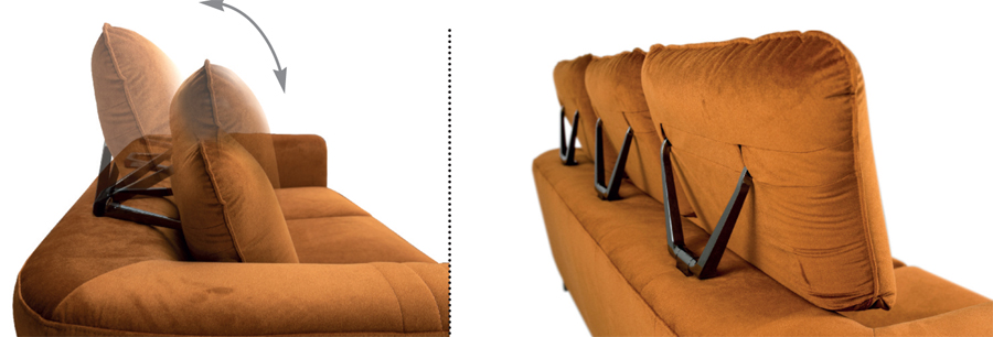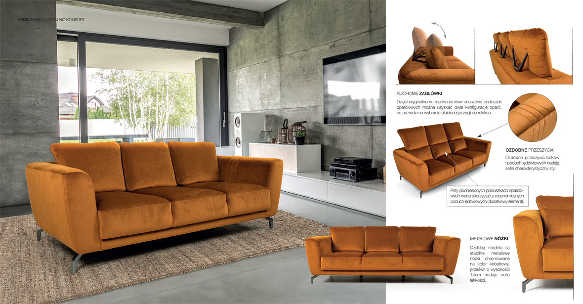 W modelu „Loano”, dzięki oryginalnemu mechanizmowi unoszenia poduszek oparciowych można uzyskać dwie konfiguracje oparć, co pozwala na wybranie ulubionej pozycji do relaksu. Ozdobne przeszycia boków i poduch lędźwiowych nadają sofie charakterystyczny wygląd. Przy podniesionych poduszkach oparciowych warto skorzystać z ergonomicznych poduch lędźwiowych. Ozdobą modelu są stabilne metalowe nóżki chromowane, a prześwit o wysokości 14 cm nadaje sofie lekkości. Możliwość wykonania w skórze i w tkaninie. Komfort i należytą wygodę zapewniają zastosowane wysokoelastyczne pianki, sprężyny bonellowe i sprężyny faliste.