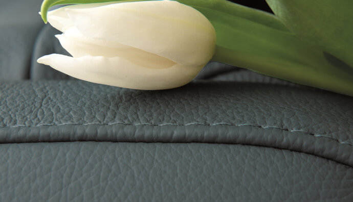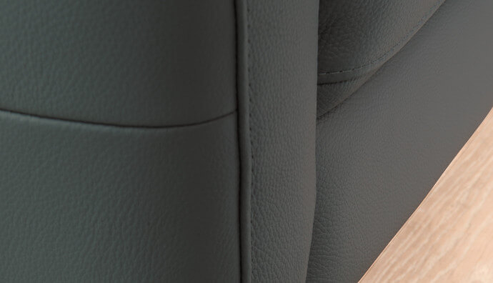 Sofa – w całości, a nie tylko niektóre części – pokrywa naturalna skóra licowa ( S2 126 – kolor: ciemno szary). Jest to wysokogatunkowa, miękka skóra, bardzo delikatna w dotyku, ale zarazem bardzo wytrzymała, o pięknej, wyraźnie widocznej fakturze. W prezentowanym modelu kolor ciemny szary.