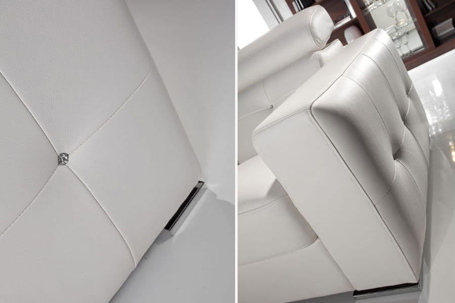 Kolekcja Diamond to klasyczny zestaw składający się z fotela, sofy 2 i sofy 3 w wariancie z funkcją spania lub bez, uzupełniony o narożnik. We wnętrzu mebla zastosowano nowoczesne pianki wysokosprężyste na siedziskach. Pikowania dostępne są zarówno na siedzisku jak i oparciu, należy to doprecyzować w trakcie składania zamówienia. Zamiast standardowych guzików przy pikowaniu można opcjonalnie skorzystać z wykończenia kryształkami Swarowskiego. Meble dostępne są zarówno w tapicerowaniu skórą naturalną jak i bogatą ofertą tkanin.