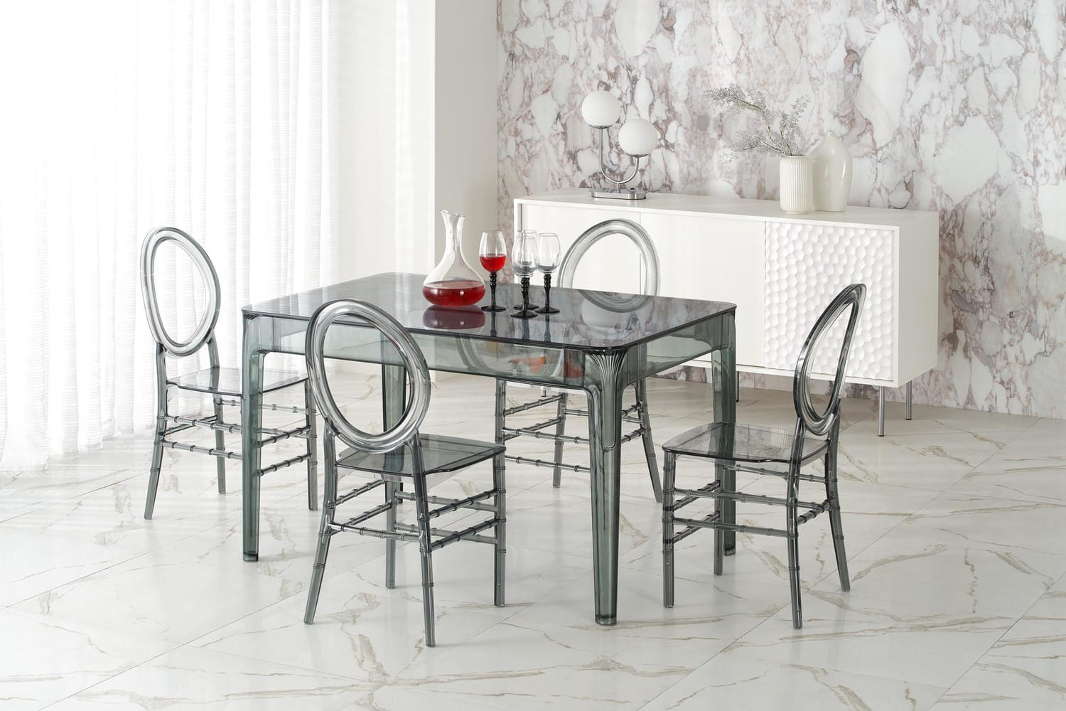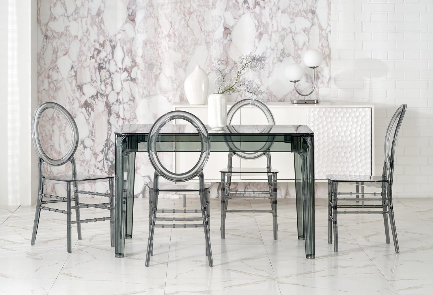Materiały zastosowane w stole Gomez są bardzo modne i eleganckie i nadadzą Twojemu wnętrzu niepowtarzalnego stylu. Dymione szkło jest również łatwe do utrzymania w czystości, a poliwęglan jest odporny na promienie UV, co oznacza, że stół zachowa swoje piękno i kolor przez wiele lat i zawsze będzie wyglądał perfekcyjnie.