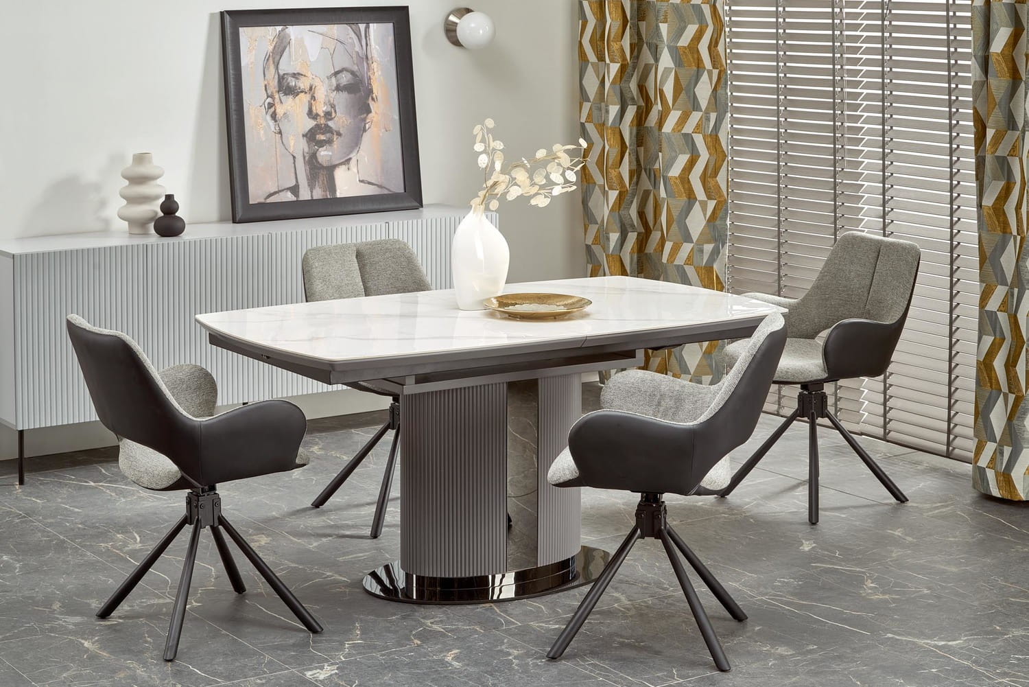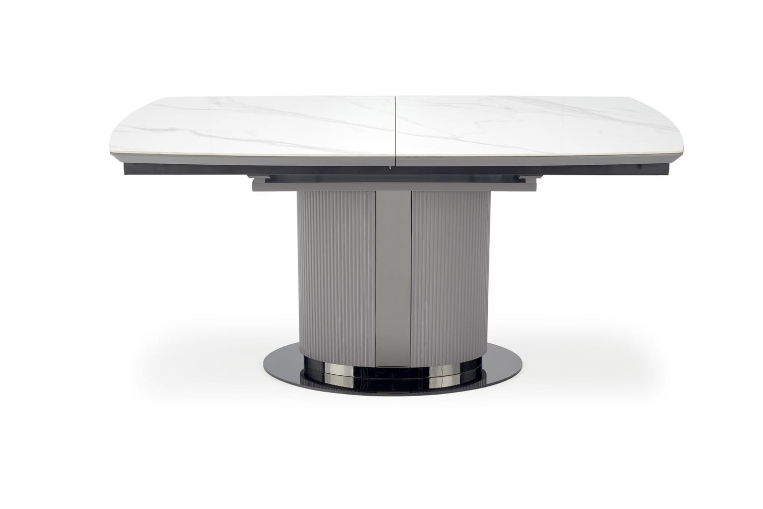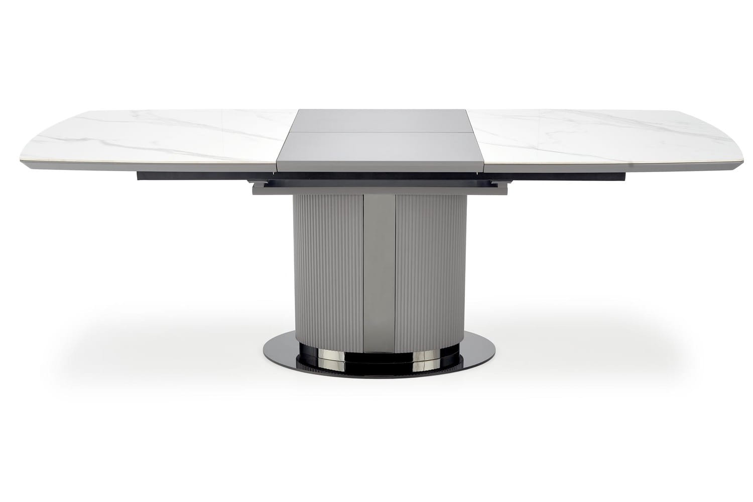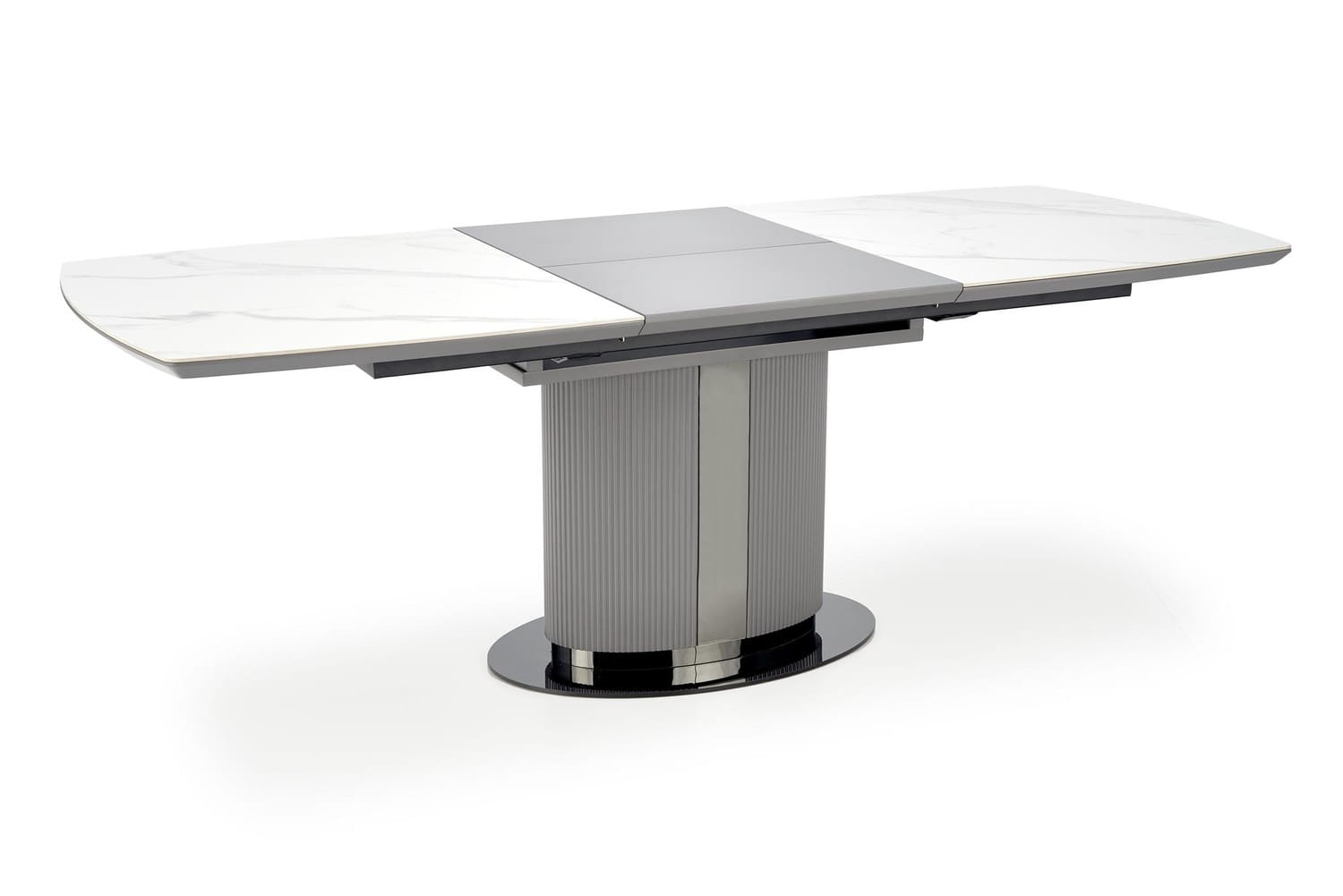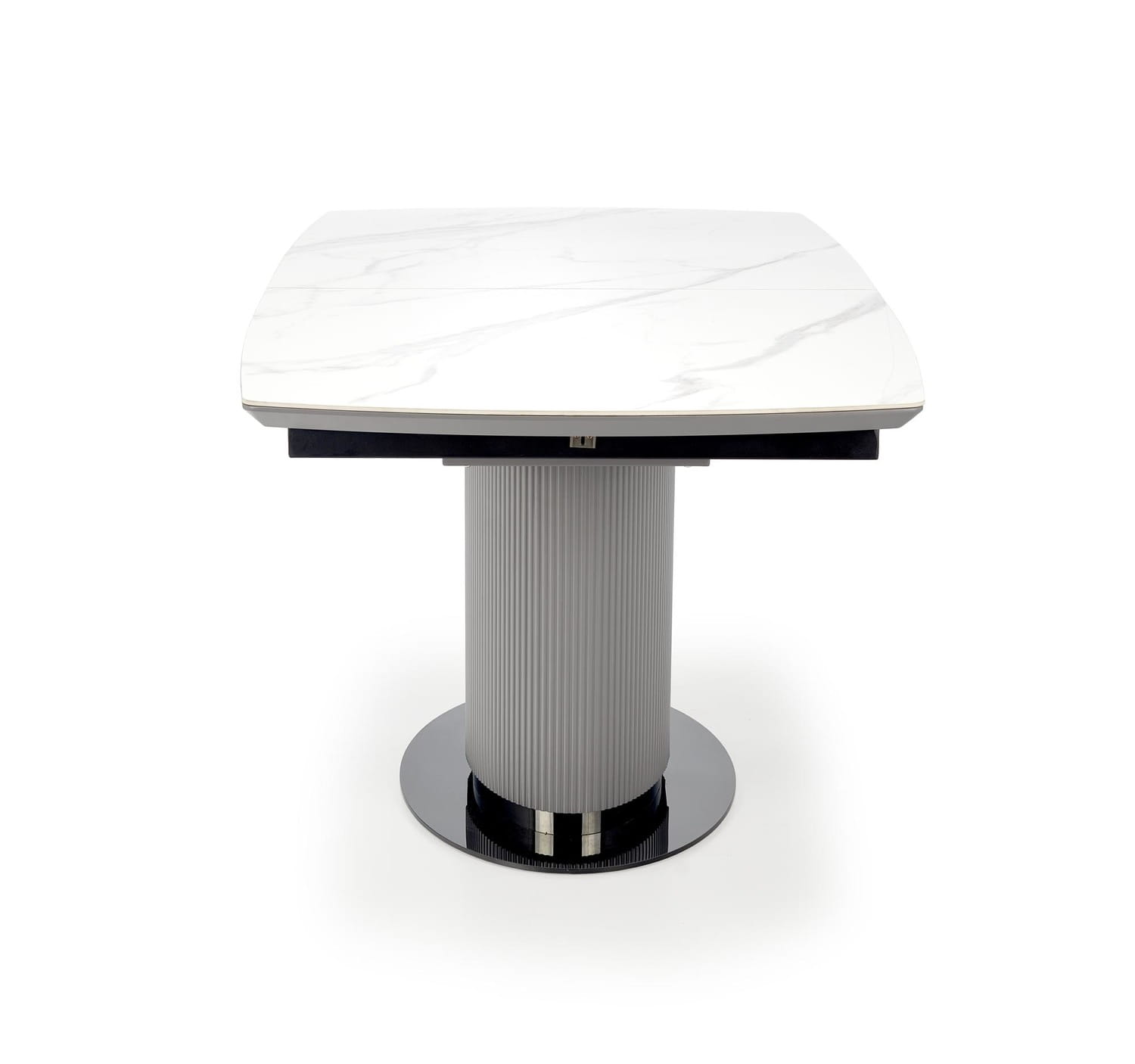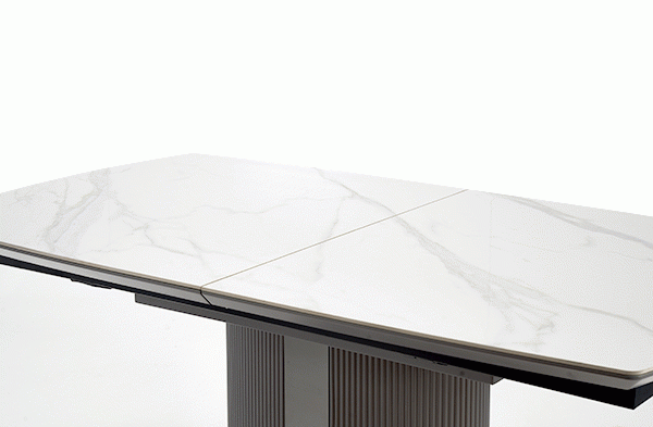 Jeśli szukasz nowoczesnego stołu, który będzie zarówno funkcjonalny, jak i stylowy, to z pewnością spodoba Ci się rozkładany stół Dancan, z blatem z ceramiki w kolorze białego marmuru i metalową, ryflowaną nogą.