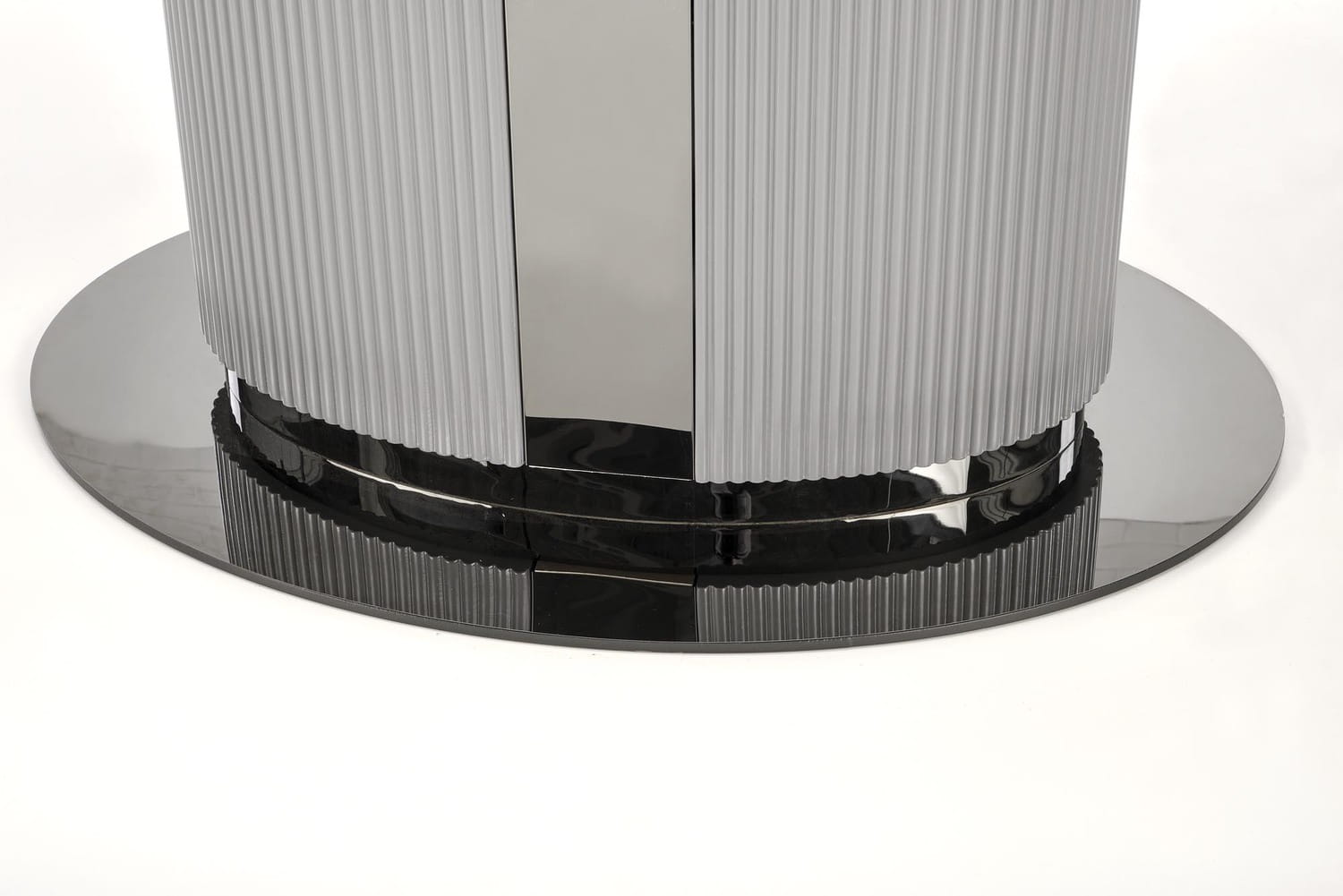 Noga wykonana z metalu w kolorze popielatym, posiada drobne ryfle, które są od pewnego czasu hitem w aranżacji wnętrz. Popielate ryfle, uzupełnione o czarną podstawę to bardzo wyrafionowane i modne połączenie.