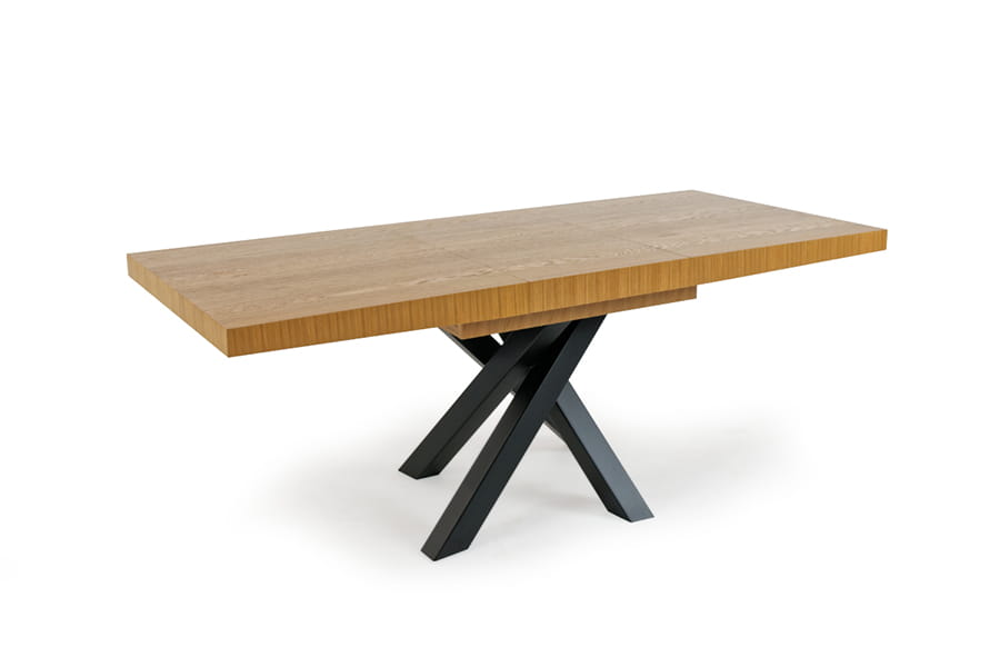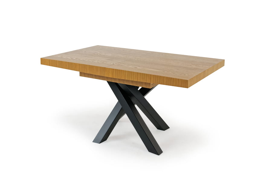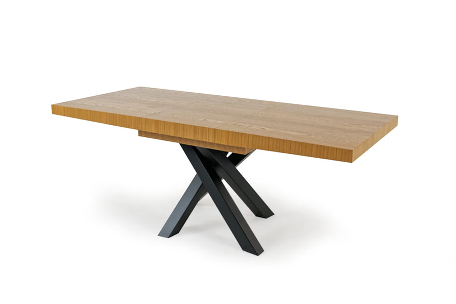 Nowoczesny stół Iryd jest idealnym rozwiązaniem dla osób poszukujących nietypowych rozwiązań do swojego wnętrza. Blat wykonany jest z drewna dębowego oraz płyty wiórowej obustronnie okleinowanej okleiną naturalną odporną na zarysowania, działanie wilgoci i zmiany temperatur. Wykończenie w wybarwieniu dąb naturalny pięknie komponuje się z czarnym stelażem ze stali malowanej proszkowo. Stół Iryd 170(270)x90 idealnie sprawdzi się w jadalni urządzonej w stylu loftowym z domieszką nowoczesności, stanowiąc w niej centralny punkt. Możliwość rozłożenia pozwala na pomieszczenie przy nim większej ilości osób, co będzie niezwykle istotne podczas imprez rodzinnych lub spotkań z przyjaciółmi.