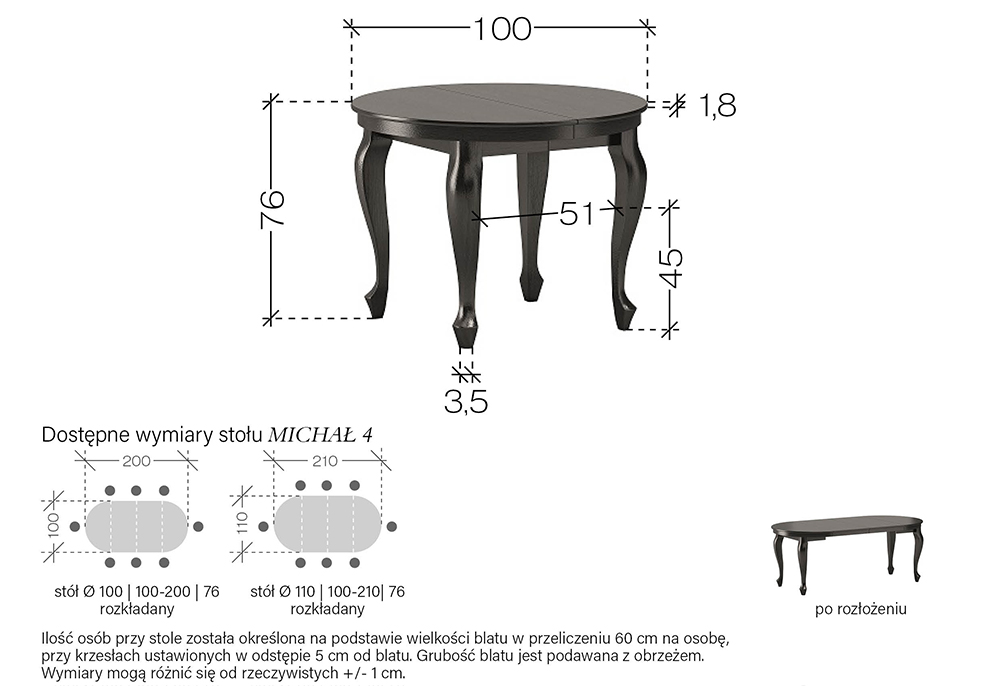 Masywna noga w stylu ludwikowskim oraz delikatny blat z litym obrzeżem, oto model Michał 4. Bardzo dużym atutem jest rozpiętość użytkowa blatu, z wymiaru 100 cm możemy uzyskać drugie tyle, instalując na prowadnicy dwa dodatkowe blaty, każdy po 50 cm. Super sprawdzi się w pomieszczeniach, kiedy zależy nam na większej przestrzeni, a w przypadku niespodziewanych gości – raz dwa i stół podwaja swoją wielkość.