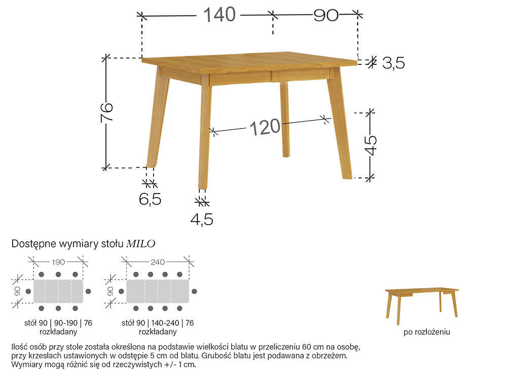 - system rozkładania: teleskopowy – jedna część blatu przesuwa się wraz z nogami, druga pozostaje nieruchoma