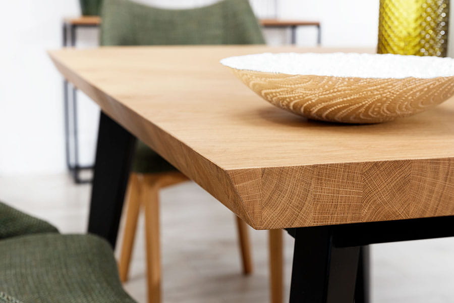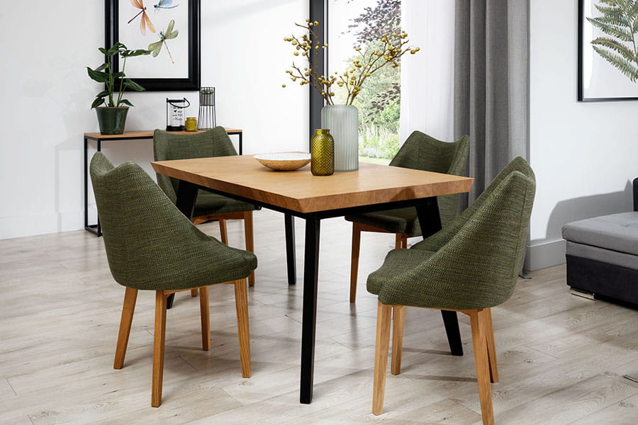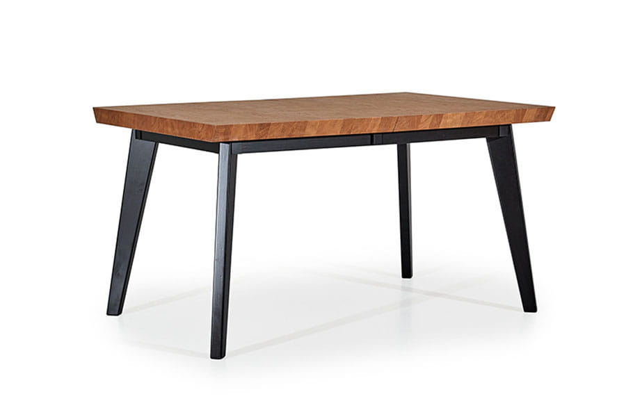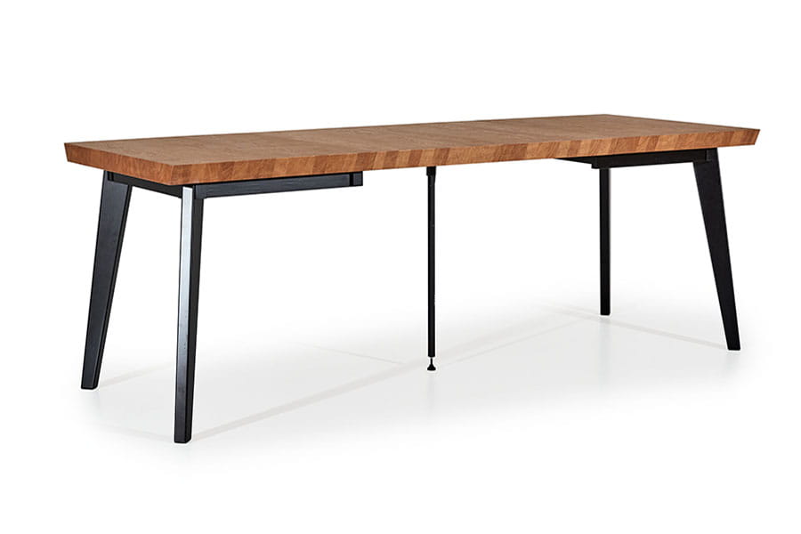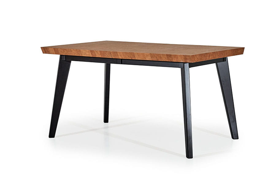Równie piękny jak brat bliźniak Nook, niby tacy sami a jednak zupełnie różni…Blat ścięty pod kątem 45 stopni, a zamiast ramki, wykończony do samych brzegów fornirem okleiny naturalnej. Niezwykle ciekawie prezentuje się krawędź z przepiękną imitacją klepki drewnianej. Blat rozkładany o dwa dodatkowe elementy – każdy po 50 cm, wspierany przez drewniane nogi oraz dodatkowy wspornik wykorzystywany przy całkowitym rozłożeniu 240 cm. Idealnie pasuje do nowoczesnych przestronnych jadali czy salonu. Sprawdzi się również w mniejszej przytulnej kuchni