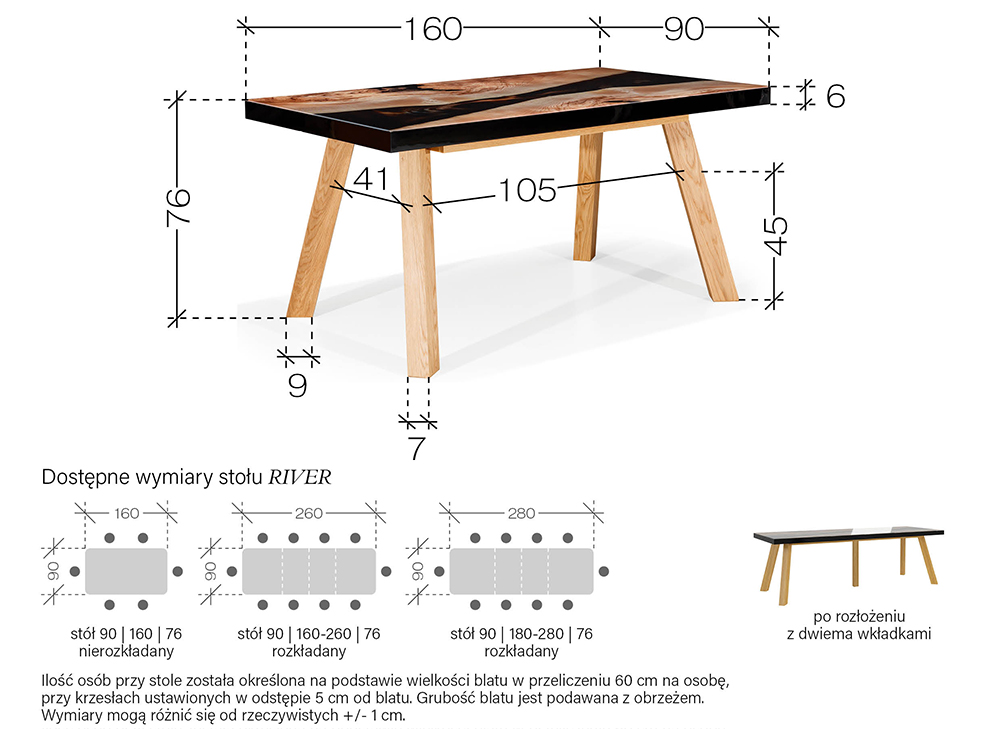 - wkłady przedłużające blat: 2 x 50 cm przechowywane wewnątrz stołu