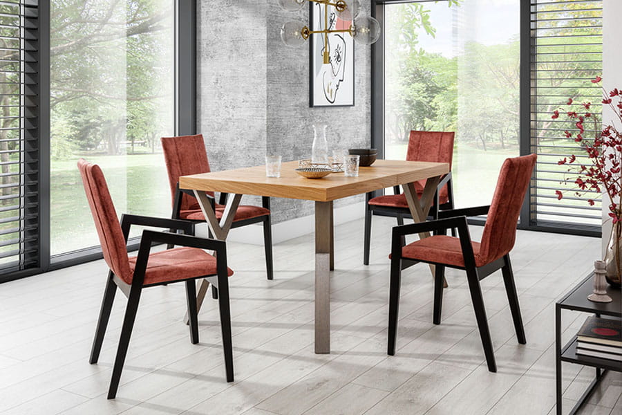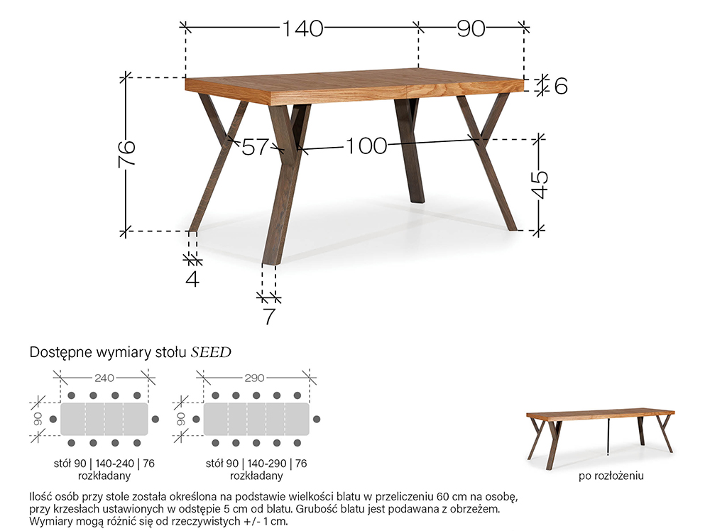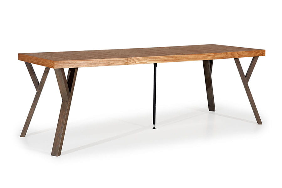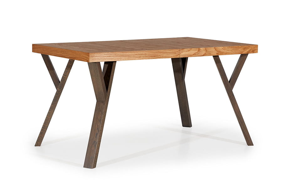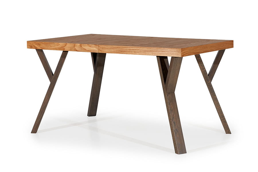 Model Seed nieszablonowe drewniane nogi w formie litery Y, ciekawa propozycja dla osób ceniących sobie indywidualność, prostotę a zarazem funkcjonalność nowoczesnego rozkładanego stołu. Prostokątny pogrubiany fornirowany blat w dwóch opcjach wymiarowych z trzema bądź dwoma dodatkowymi blatami, każdy po 50 cm. W zależności od potrzeb to Ty decydujesz ile wkładek zastosować, szereg możliwości i kombinacji w ustawieniu długości blatu.