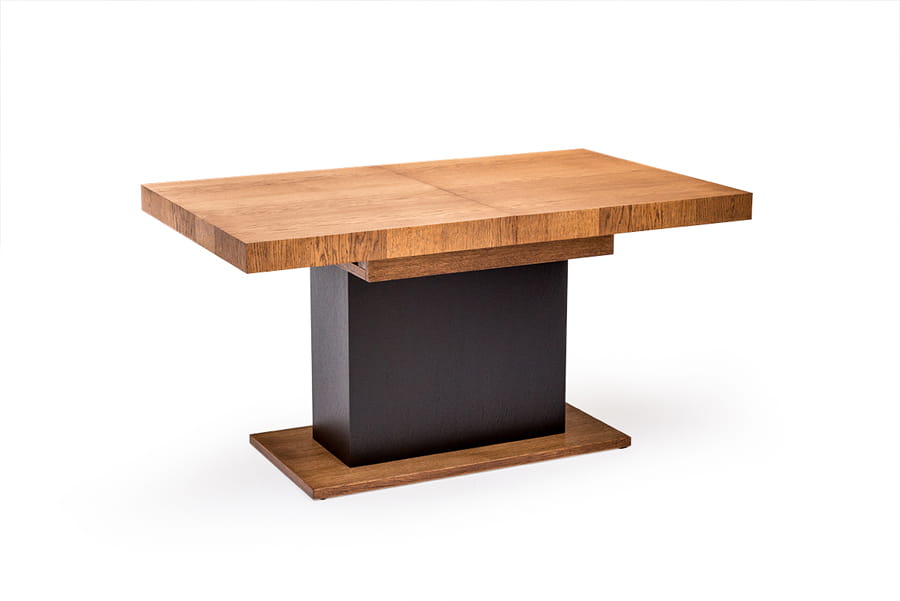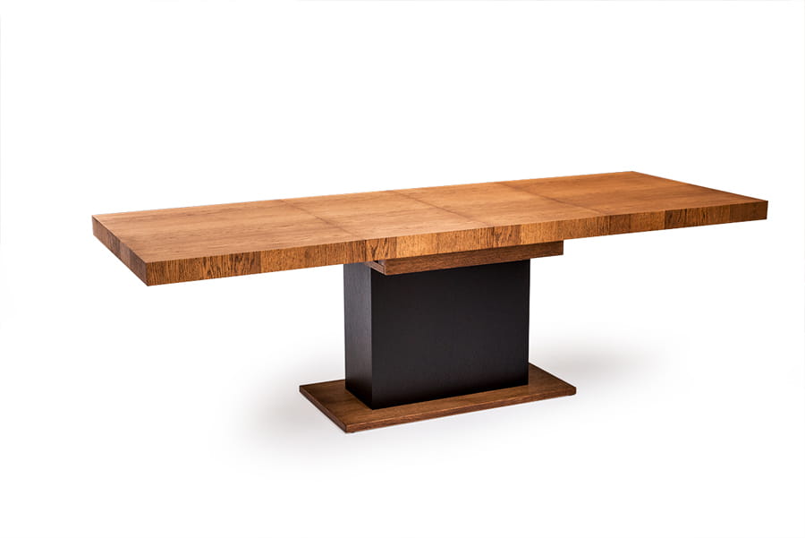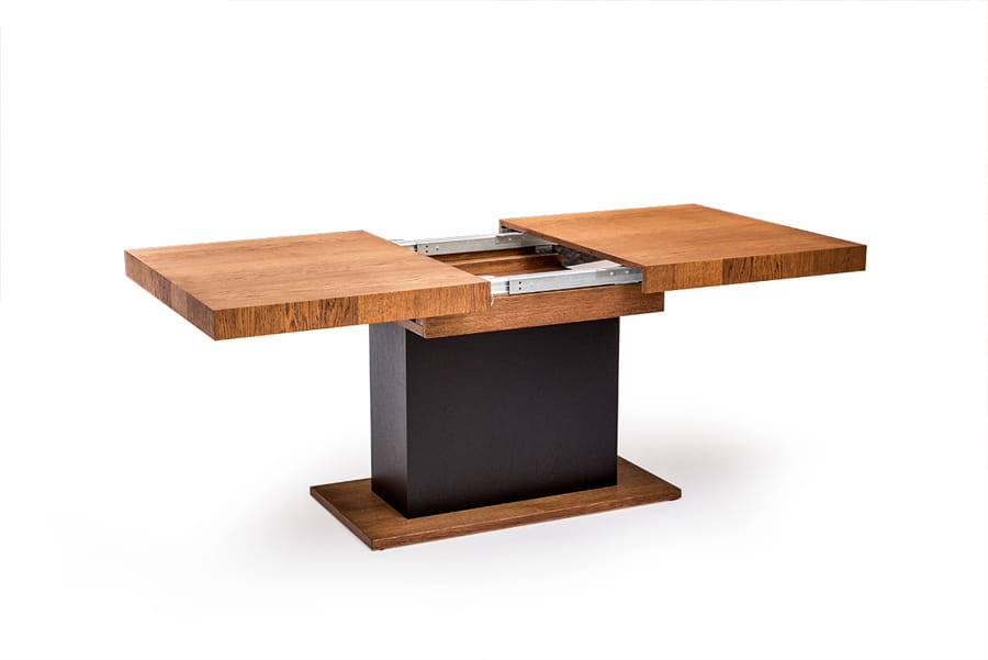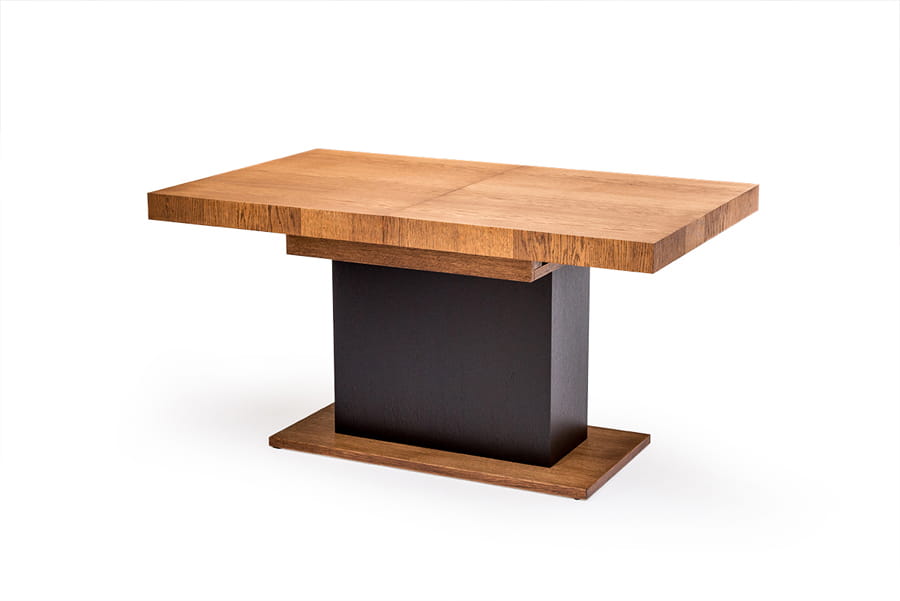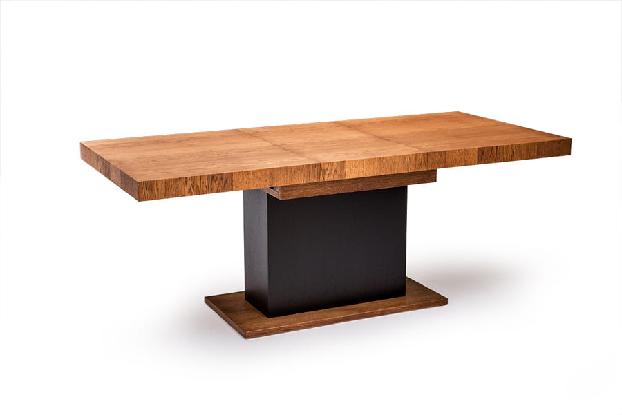 Dla miłośników nowoczesnego designu w jadalni stół kolumnowy z kolekcji Valentino, który będzie też modnym dopełnieniem Twojej aranżacji. Zamiast klasycznych czterech nóżek mebel ten posiada jedną, solidną podstawę, która świetnie komponuje się z usłojeniem naturalnego drewna. Stół kolumnowy zachwyca swoim wyglądem, ale również i wykończeniem z trwałego materiału litego drewna dębowego oraz forniru. Rozkładany blat, który posiada dwie długości który łatwo dopasujesz do konkretnej uroczystości.