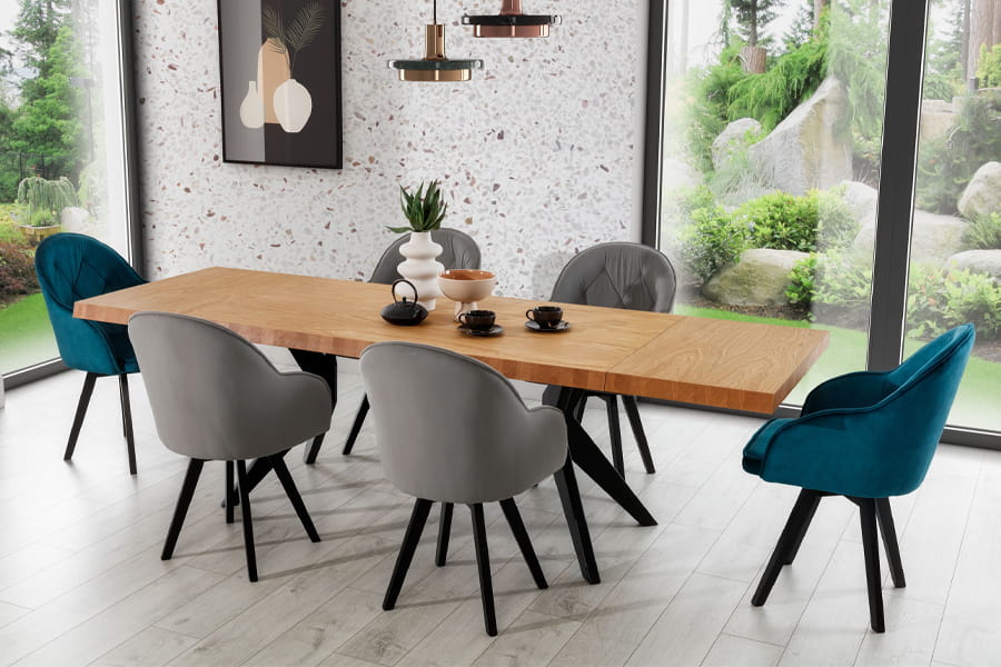 Milo 90x160-240 cm to stół który z powodzeniem wstawić można zarówno do jadalni, jak i do salonu. Dobrze prezentować będzie się on we wnętrzach tak klasycznych, jak i nowoczesnych. Stół posiada klasyczną, ponadczasową formę. Sprawdzi się on tak na co dzień, jak i podczas spotkań rodzinnych. Wyposażony został bowiem w funkcję rozkładania. W zestawie znajdziemy 2 wkłady przedłużające blat, każdy o szerokości 40 centymetrów. Stół Vero posiada teleskopowy system rozkładania. Jedna część blatu przesuwa się tutaj razem z nogami, druga - pozostaje nieruchoma. Szerokość stołu przed rozłożeniem to 160 cm, po - 240 cm. Mebel ma wysokość 76 cm i głębokość 90 cm. Stół został wykonany z wysokiej jakości drewna dębowego, które charakteryzuje się dużą trwałością i odpornością na uszkodzenia.