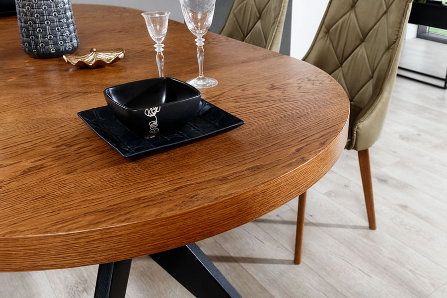 Prosty, subtelny a zarazem solidy i wytrzymały stół. Drewniana noga w kolorze intensywnej czerni oraz warstwa drewna na pogrubionym blacie daje naprawdę finezyjny efekt. Model kusi nie tylko w wersji przed rozłożeniem. Dostępny w dwóch różnych wymiarach oraz z dwiema różnymi długościami blatów dodatkowych aż do 230 cm. Urozmaici nie jeden salon, jadalnię czy kuchnię.