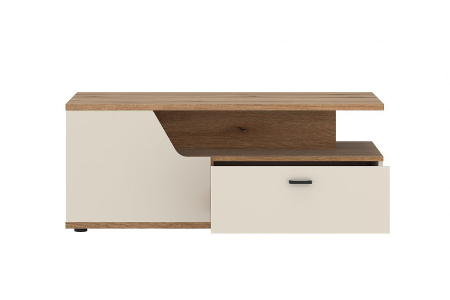 W kolekcji Cut Out matowy kaszmir gra pierwsze skrzypce, ale to jego połączenie z ciepłym dekorem Dąb Coast Evoke oraz przeszkleniami w bokach witryn i komód nadaje meblom wyjątkowego charakteru. Dodatkowe oświetlenie LED (w zestawie) efektownie podkreśla zawartość mebli, tworząc przytulną atmosferę sprzyjającą wspólnym chwilom.