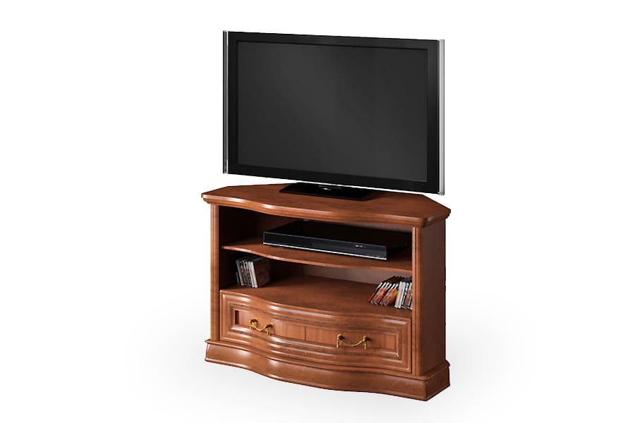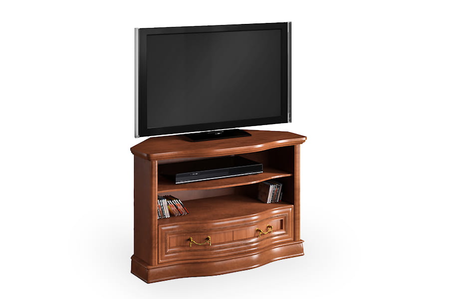 Stolik narożny RTV Rupert NAR-S firmy Latzke świetnie wkomponuje się w przestronne i elegancko umeblowane wnętrze. Jest pięknie wykończona, ponieważ posiada rzeźbione detale oraz delikatnie łamany zaokrągloną linią front. Te elementy wraz z ozdobnymi uchwytami są oznaką elegancji i kunsztu klasycznego rzemiosła. Mebel będzie na co dzień bardzo praktyczny, ponieważ posiada pojemną szufladę i dwie półki na sprzęt. Stolik rtv wykonana jest z wysokiej jakości materiałów, które dbają o jej wysoką trwałość i odporność na niszczenie. Domyślny kolor dla tego produktu to czereśnia liguryjska.
