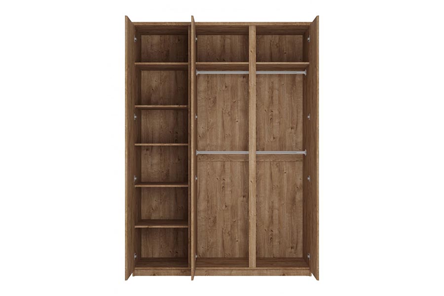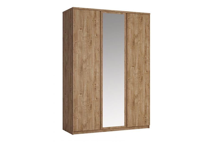 Trzydrzwiowa szafa z lustrem z kolekcji Fribo charakteryzuje się prostą minimalistyczną formą, która sprawia, że mebel pasuje do wielu wnętrz, dekor przypominający drewno wprowadzi w pomieszczeniu przytulny klimat, a lustro umieszczone na jej froncie optycznie powiększy przestrzeń. Pojemne i funkcjonalne wnętrze szafy zapewnia dużo miejsca do przechowywania. Wnętrze szafy oferuje przestrzeń z drążkami na ubrania, nad nimi znajdują się półki, które można wykorzystać do mniej używanych rzeczy. Pięć praktycznych półek ukryte za pełnym frontem pomogą uporządkować odzież. Przestronna szafa idealnie współgra z pozostałymi elementami z kolekcji Fribo. Mebel doskonale sprawdzi się, jako element wyposażenia wielu pomieszczeń.