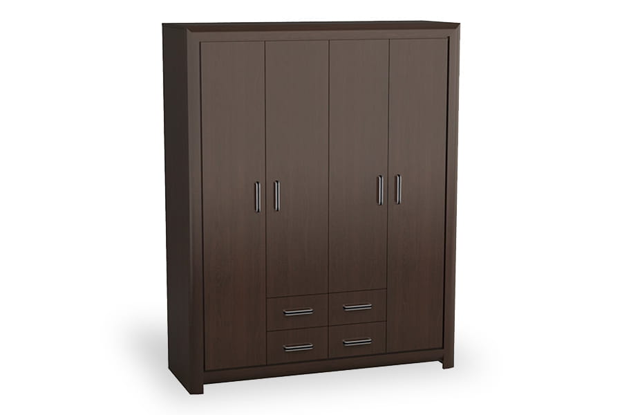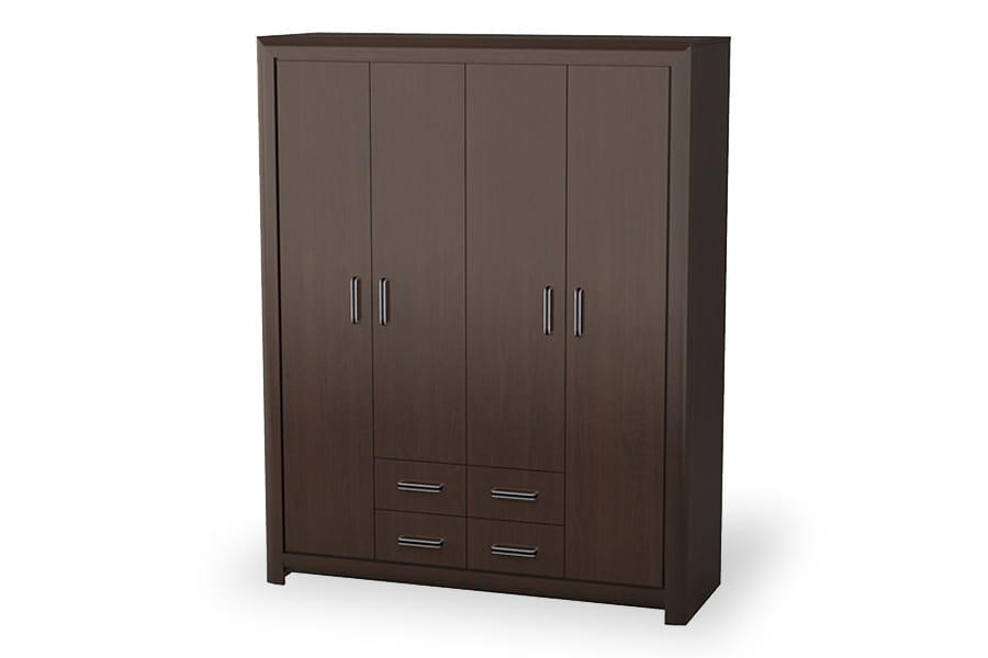 - szafa posiada czterodrzwiowy front z czterema szufladami, wewnątrz znajdują się półki oraz drążek na wieszaki