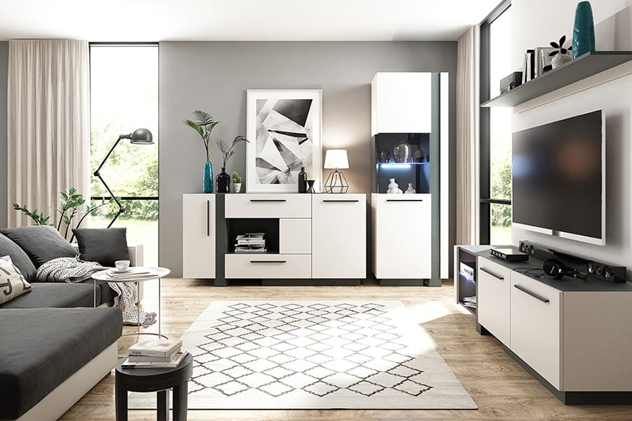 Kolekcja mebli Denali to nowoczesny design z elementami stylu industrialnego. Połączenie naturalnego dekoru dębu artisan z gładkim odcieniem grafitu oraz bieli alpejskiej z grafitem doskonale wpisuje się w aktualne trendy. Ciekawymi akcentami , które wyróżniają kolekcję są narożne przeszklenia witryn oraz długie, metalowe uchwyty w kolorze czarny mat. Komfort użytkowania zapewnią zastosowane akcesoria meblowe takie jak zawiasy i prowadnice z cichym domykiem.