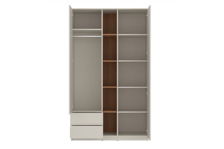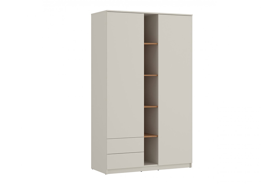 - Szafę dwudrzwiową FANO wyróżnia nowoczesna, a zarazem wyjątkowo funkcjonalna stylistyka, zachwycająca designem i praktycznością codziennego zastosowania. Pojemna szafa w odcieniu Kaszmir wykonana została w systemie bezuchwytowym, zapewniającym minimalistyczny efekt wizualny. Element w postaci otwartych półek w odcieniu Dąb Karmel dodaje bryle unikalnego charakteru, a jednocześnie zapewnia możliwość ekspozycji niewielkich przedmiotów dekoracyjnych. Szafa powstała z płyty wiórowej laminowanej. Szuflady mebla wyposażono w prowadnice kulkowe, zapewniające pełen wysuw. Za frontami drzwiowymi znajduje się drążek, pozwalający na zawieszenie odzieży na wieszakach oraz pojemne półki na odzież złożoną.