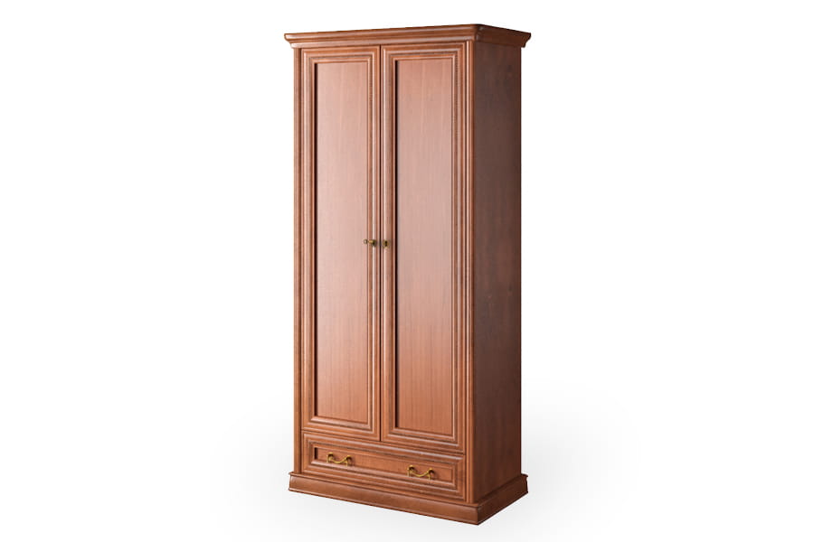 Szafa Rupert 2D firmy Latzke świetnie wkomponuje się w przestronne i elegancko umeblowane wnętrze. Jest pięknie wykończona, ponieważ posiada rzeźbione detale oraz delikatnie łamany zaokrągloną linią front. Te elementy wraz z ozdobnymi uchwytami są oznaką elegancji i kunsztu klasycznego rzemiosła. Mebel posiada wszystkie praktyczne akcesoria, czyli wewnętrzną półkę i drążek do porządkowania ubrań oraz pojemną szufladę na drobną garderobę. Szafa wykonana jest z wysokiej jakości materiałów, które dbają o jej wysoką trwałość i odporność na niszczenie. Domyślny kolor dla tego produktu to czereśnia liguryjska.