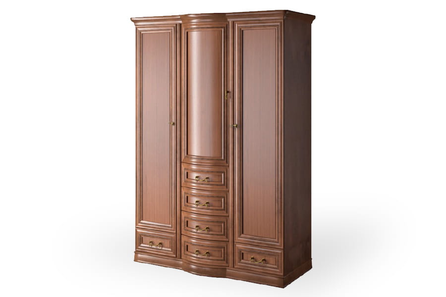 Szafa Rupert 3D-L firmy Latzke świetnie wkomponuje się w przestronne i elegancko umeblowane wnętrze. Jest pięknie wykończona, ponieważ posiada rzeźbione detale oraz delikatnie łamany zaokrągloną linią front. Te elementy wraz z ozdobnymi uchwytami są oznaką elegancji i kunsztu klasycznego rzemiosła. Jej konstrukcja obejmuje trzy segmenty szafek i szuflad, dzięki czemu łatwo znajdziesz w miej miejsce na wszystkie ubrania. Dodatkową zaletą są lustra na froncie, które przydadzą się podczas przymiarek. Szafa wykonana jest z wysokiej jakości materiałów, które dbają o jej wysoką trwałość i odporność na niszczenie. Domyślny kolor dla tego produktu to czereśnia liguryjska.