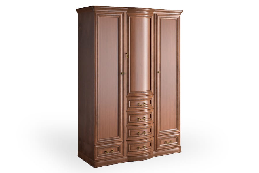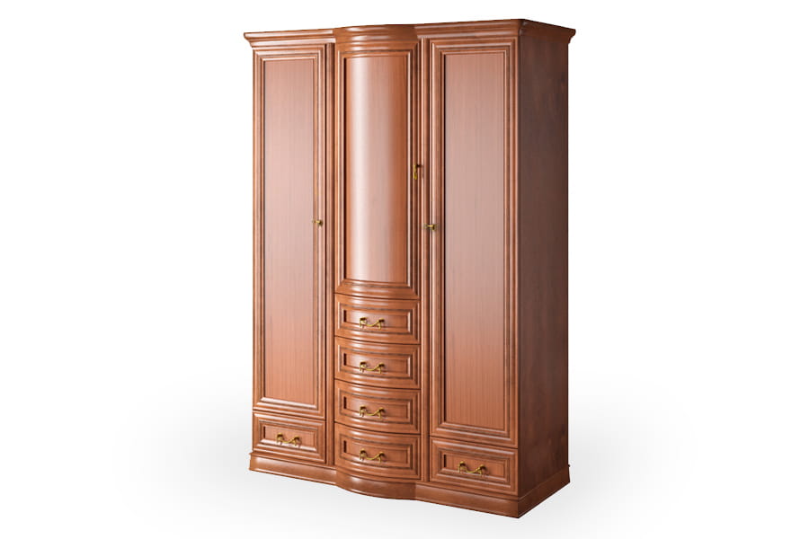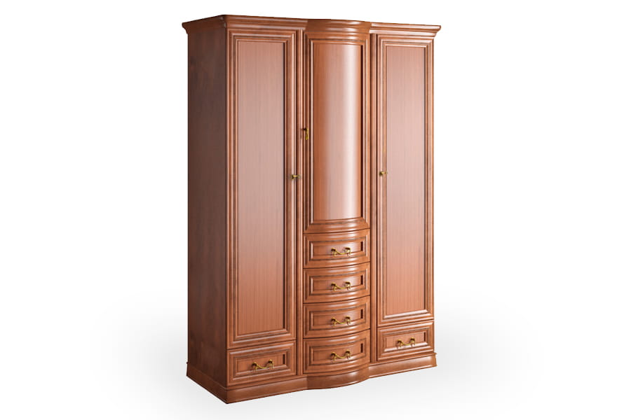 Szafa Rupert 4D firmy Latzke świetnie wkomponuje się w przestronne i elegancko umeblowane wnętrze. Jest pięknie wykończona, ponieważ posiada rzeźbione detale oraz delikatnie łamany zaokrągloną linią front. Te elementy wraz z ozdobnymi uchwytami są oznaką elegancji i kunsztu klasycznego rzemiosła. Mebel posiada wszystkie praktyczne akcesoria, czyli wewnętrzną półkę i drążek do porządkowania ubrań, dwie bieliźniarki oraz pojemne szuflady na drobną garderobę. Szafa wykonana jest z wysokiej jakości materiałów, które dbają o jej wysoką trwałość i odporność na niszczenie. Domyślny kolor dla tego produktu to czereśnia liguryjska.