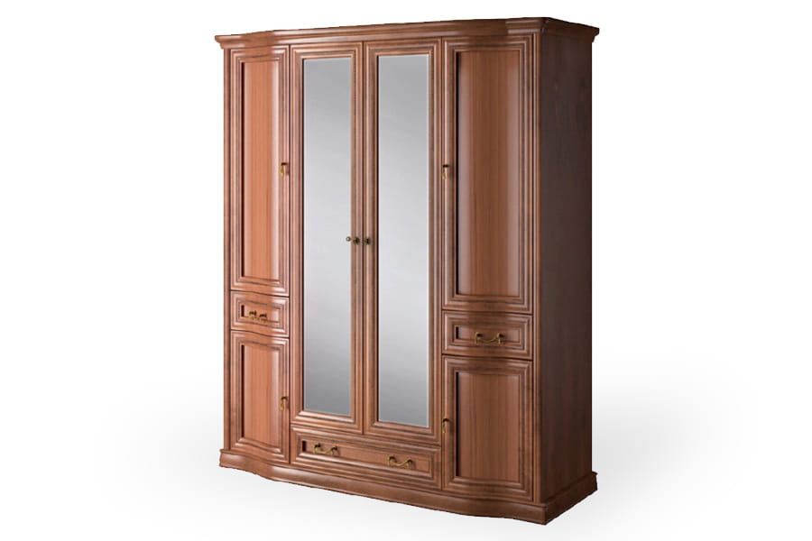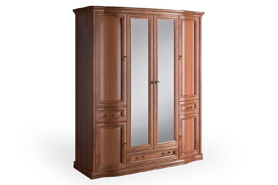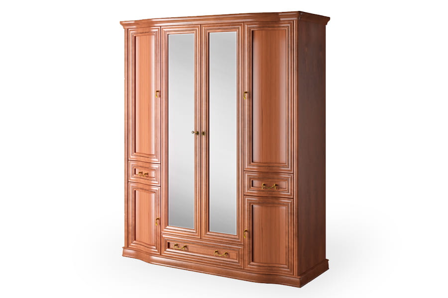 Szafa Rupert 4D-L firmy Latzke świetnie wkomponuje się w przestronne i elegancko umeblowane wnętrze. Jest pięknie wykończona, ponieważ posiada rzeźbione detale oraz delikatnie łamany zaokrągloną linią front. Te elementy wraz z ozdobnymi uchwytami są oznaką elegancji i kunsztu klasycznego rzemiosła. Mebel posiada wszystkie praktyczne akcesoria, czyli wewnętrzną półkę i drążek do porządkowania ubrań, dwie bieliźniarki oraz pojemne szuflady na drobną garderobę. Dodatkową zaletą są lustra na froncie, które przydadzą się podczas przymiarek. Szafa wykonana jest z wysokiej jakości materiałów, które dbają o jej wysoką trwałość i odporność na niszczenie. Domyślny kolor dla tego produktu to czereśnia liguryjska.