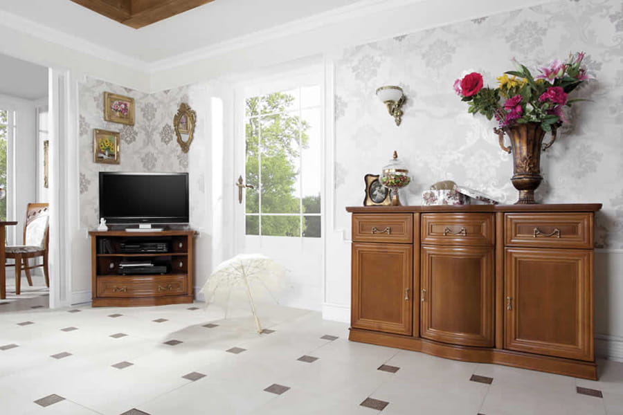 Komoda Rupert 3D-2SZ firmy Latzke świetnie wkomponuje się w przestronne i elegancko umeblowane wnętrze. Jest pięknie wykończona, ponieważ posiada rzeźbione detale oraz delikatnie łamany zaokrągloną linią front. Te elementy wraz z ozdobnymi uchwytami są oznaką elegancji i kunsztu klasycznego rzemiosła. Do zalet mebla można z powodzeniem zaliczyć pojemne wnętrze, które składa się z czterech dużych szafek, szuflad oraz części z witryną do której przydatne będzie dodatkowe oświetlenie ( za dodatkowa opłatą ). Kredens Rupert wykonana jest z wysokiej jakości materiałów, które dbają o jej wysoką trwałość i odporność na niszczenie. Domyślny kolor dla tego produktu to czereśnia liguryjska