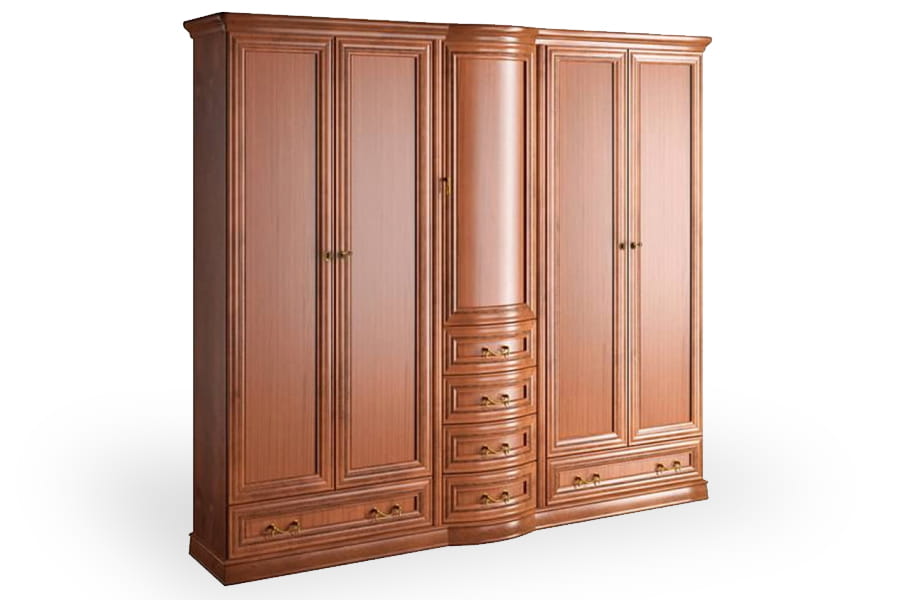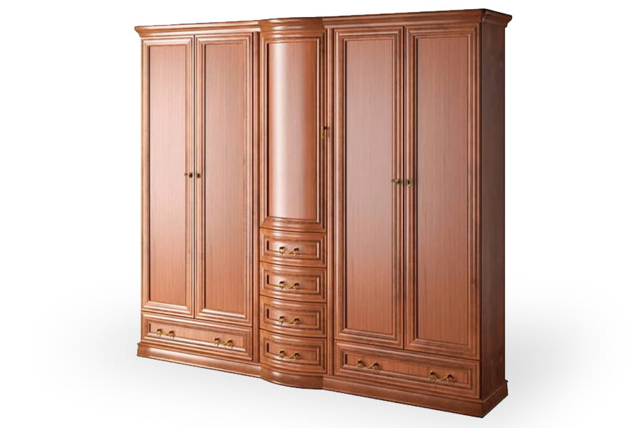 Szafa Rupert 5D firmy Latzke świetnie wkomponuje się w przestronne i elegancko umeblowane wnętrze. Jest pięknie wykończona, ponieważ posiada rzeźbione detale oraz delikatnie łamany zaokrągloną linią front. Te elementy wraz z ozdobnymi uchwytami są oznaką elegancji i kunsztu klasycznego rzemiosła. W pięciu okazałych szafkach uzupełnionych licznymi szufladami znajdziesz miejsce na garderobę całej rodziny oraz różne akcesoria domowe. Szafa wykonana jest z wysokiej jakości materiałów, które dbają o jej wysoką trwałość i odporność na niszczenie. Domyślny kolor dla tego produktu to czereśnia liguryjska.