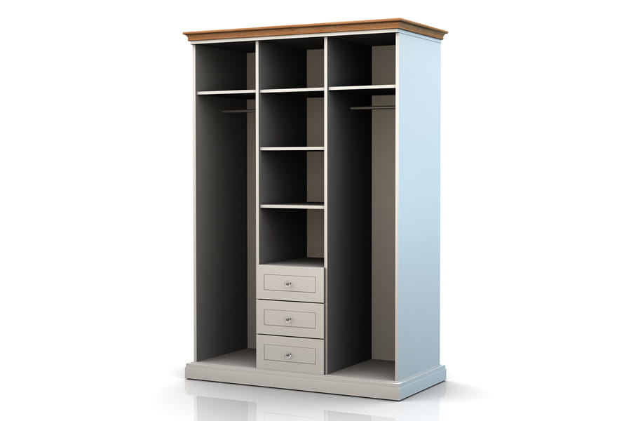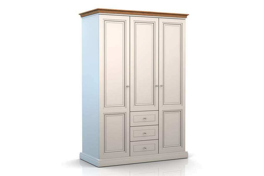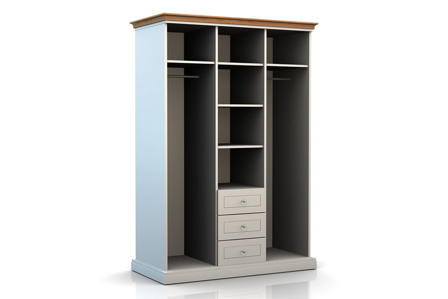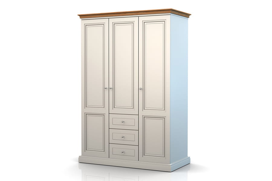 - wewnątrz szafy 2 drążki na ubrania oraz półki na ubrania pod którymi mieszczą się 3 szuflady