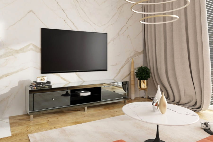 Grafitowa szafka pod telewizor to doskonałe uzupełnienie Twojego salonu ciekawym i funkcjonalnym meblem. Sprawdza się jako podstawa pod telewizor stojący, ale równie dobrze prezentuje się pod telewizorem wiszącym. Wykonana z najwyższej jakości szkła o kolorze grafitowym, prezentuje się oszałamiająco. Na frontach oraz blacie widać odbicie pokoju, co w połączeniu z szarym kolorem sprawia niesamowite wrażenie. Łatwo też jest utrzymać na niej porządek. Dwie centralne półki pełnią istotną rolę – można tam umieścić ważne urządzenia współpracujące z telewizorem, przykładowo dekoder lub kino domowe. Taka lokacja zapewni dostęp do nich za pomocą pilota z każdego miejsca w salonie. Dwie pojemne szafki po bokach mogą natomiast ukryć drobiazgi i ważne przedmioty – schować do nich można dokumenty, środki do czyszczenia szafki RTV czy zapas baterii. Szklana szafka pod telewizor posiada sześć aluminiowych nóżek, które zapewniają jej odpowiednią stabilność, co jest szczególnie ważne przy telewizorach stojących na szafce.