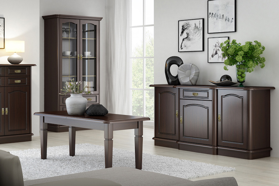 - Klasyczny styl mebli podkreślają ozdobne korony oraz metalowe stylizowane uchwyty.
