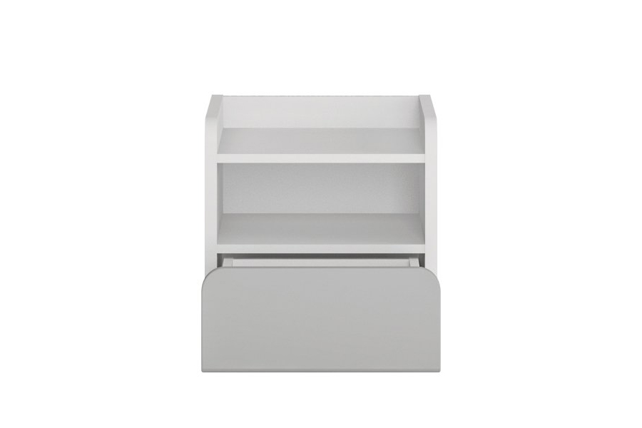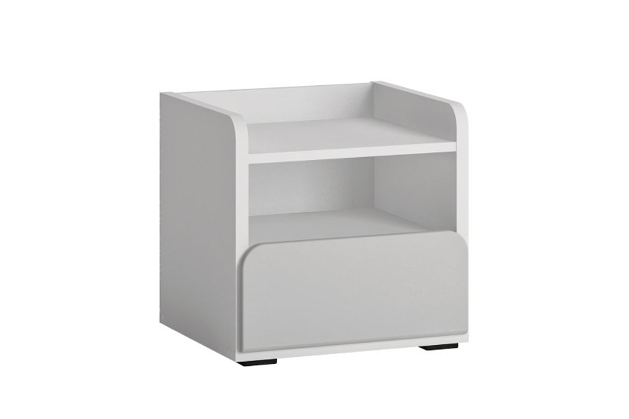 - Funkcjonalna szafka nocna wyposażona w wygodną szufladę, otwartą przestrzeń oraz półkę zabezpieczoną po bokach w taki sposób, aby nic z niej nie spadło.