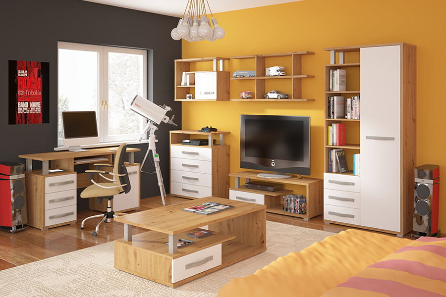 Kolekcja ANGEL to nowoczesne meble przeznaczone do aranżacji pokoju dziennego lub pokoju młodzieżowego. System mebli został wykonany z wysokiej jakości płyty laminowanej. Kolekcja została wykonana w kilku wersjach kolorystycznych do wyboru, dzięki czemu na pewno znajdziemy coś dla siebie. Dzięki użytym do produkcji materiałom mamy pewność, że meble będą nam służyć przez długie lata.