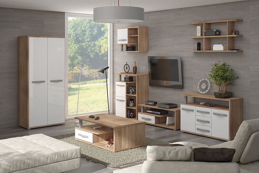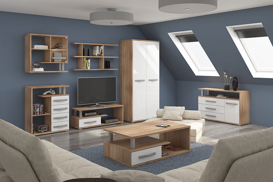 Kolekcja ANGEL to nowoczesne meble przeznaczone do aranżacji pokoju dziennego lub pokoju młodzieżowego. System mebli został wykonany z wysokiej jakości płyty laminowanej. Kolekcja została wykonana w kilku wersjach kolorystycznych do wyboru, dzięki czemu na pewno znajdziemy coś dla siebie. Dzięki użytym do produkcji materiałom mamy pewność, że meble będą nam służyć przez długie lata.