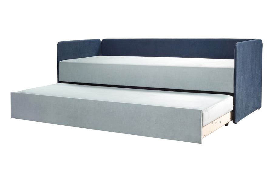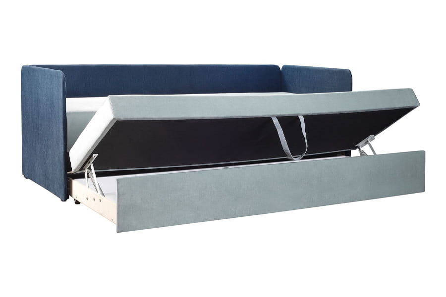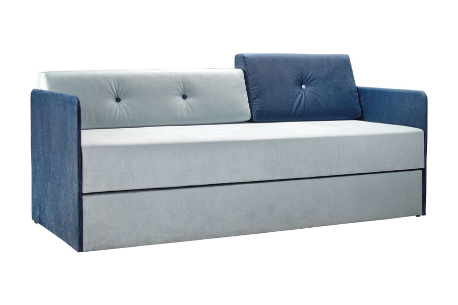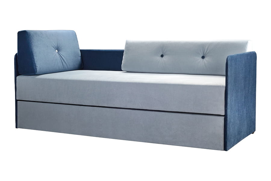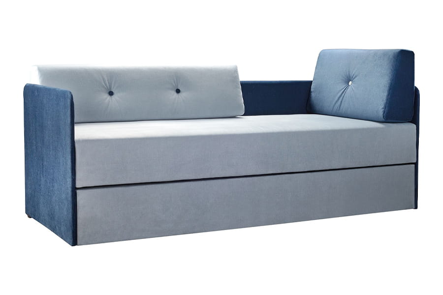 DUET to połączenie sofy i łóżka piętrowego. Dzięki pomysłowemu rozwiązaniu, w wersji złożonej mebel pełni funkcję sofy do siedzenia, w wersji rozłożonej są dwie niezależne powierzchnie do spania. Luźne poduszki oparciowe wykonane z formatek piankowych doskonale sprawdzają się jako stabilne oparcie. Pikowania na poduszkach wykonane w kontrastowych kolorach są dodatkowym elementem ozdobnym asymetrycznych poduszek. Mebel ma biały estetyczny pojemnik na pościel i sprężyny wspomagające podnoszenie siedziska. Siedzisko wypełnione sprężyną bonellową.