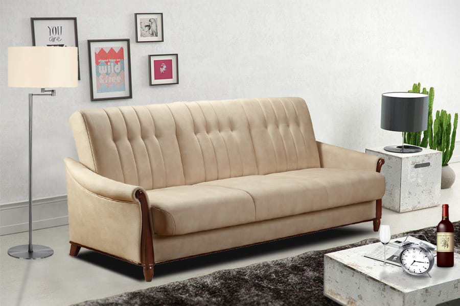 Niezwykle funkcjonalna wersalka Michael to udane połączenie ponadczasowej formy z eleganckim i stylowym wyglądem. Dzięki zastosowaniu w siedzisku i oparciu sprężyn falistych zapewni doskonałe wsparcie dla pleców podczas siedzenia oraz jednorodne i komfortowe spanie podczas nocnego wypoczynku. W modelu zastosowano ponadto podwyższone siedzisko co dodatkowo podnosi walory wersalki. Uwagę zwracają także wysokie podłokietniki oraz eleganckie, drewniane wstawki i nóżki.