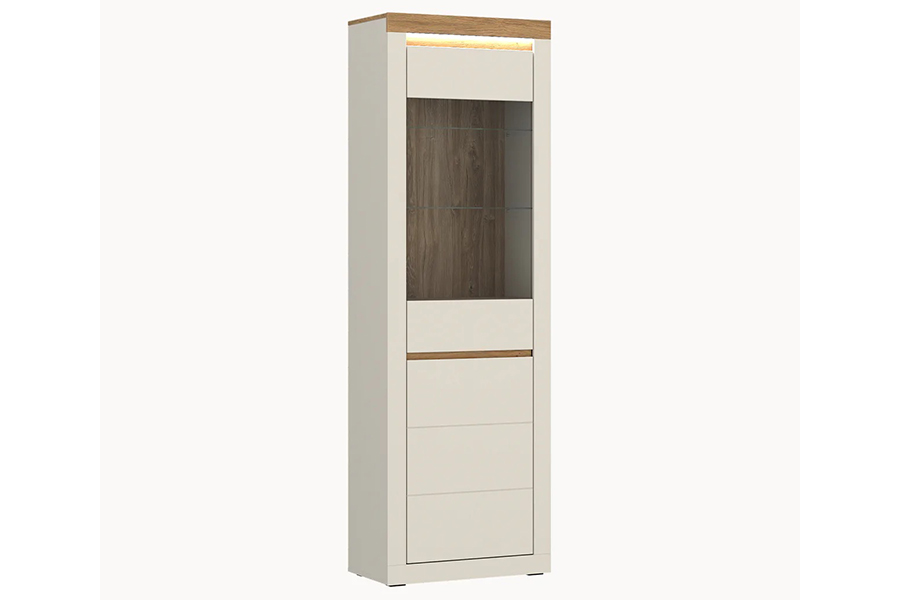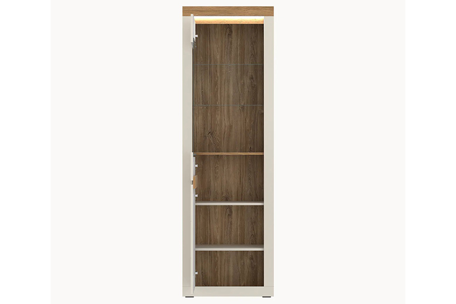 - Jednodrzwiowa witryna o wymiarach 64,2 × 204,7 × 39,6 cm łączy prezentację dekoracji ze sprytną organizacją przestrzeni. Smukła, wysoka bryła zapewnia dużo miejsca na przechowywanie przy niewielkim zajęciu szerokości ściany, co sprawdza się w salonie, jadalni lub gabinecie.
