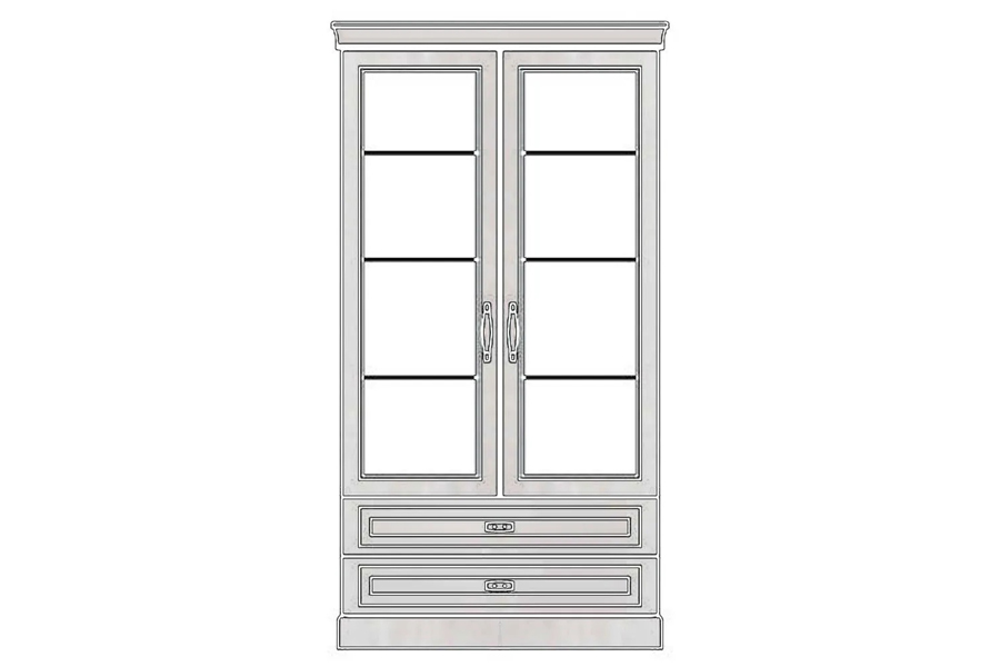 - Witryna składa się z części dwudrzwiowej, dwóch półek oraz szuflady